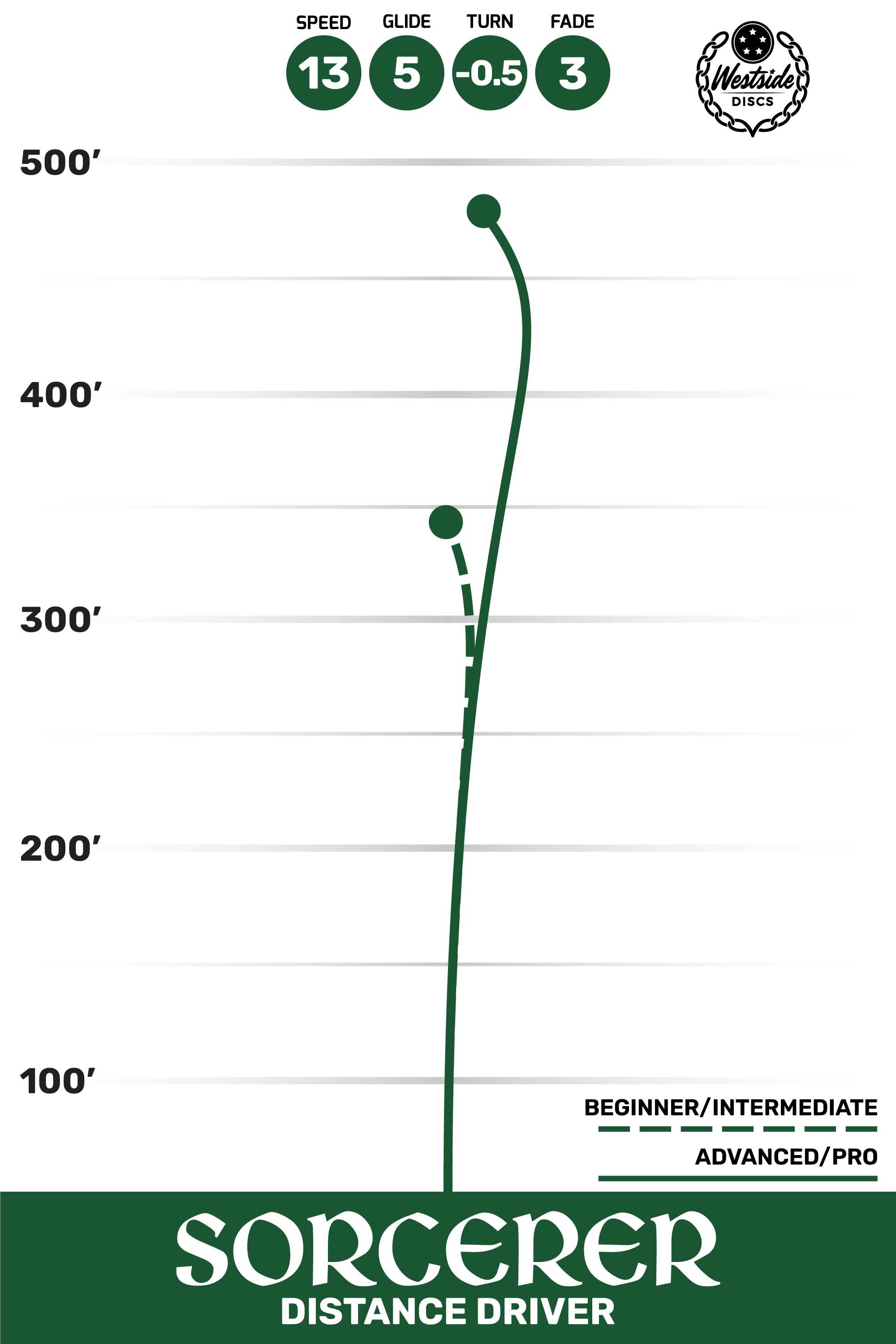 The Sorcerer is Westside's answer for a high speed disc for all skill levels. With a smaller grip than most high speed discs, the Sorcerer leaves the hand fast. For professional players, it is great for long anhyzers that actually come back when it runs out of speed. The Sorcerer provides a nice long "S" curve line. For lower arm speeds, the Sorcerer will actually get flat and glide before diving to the left. Many drivers designed for slower arm speeds have poor flight integrity. The sorcerer will give you that "pro throw" you have been looking for on the course.