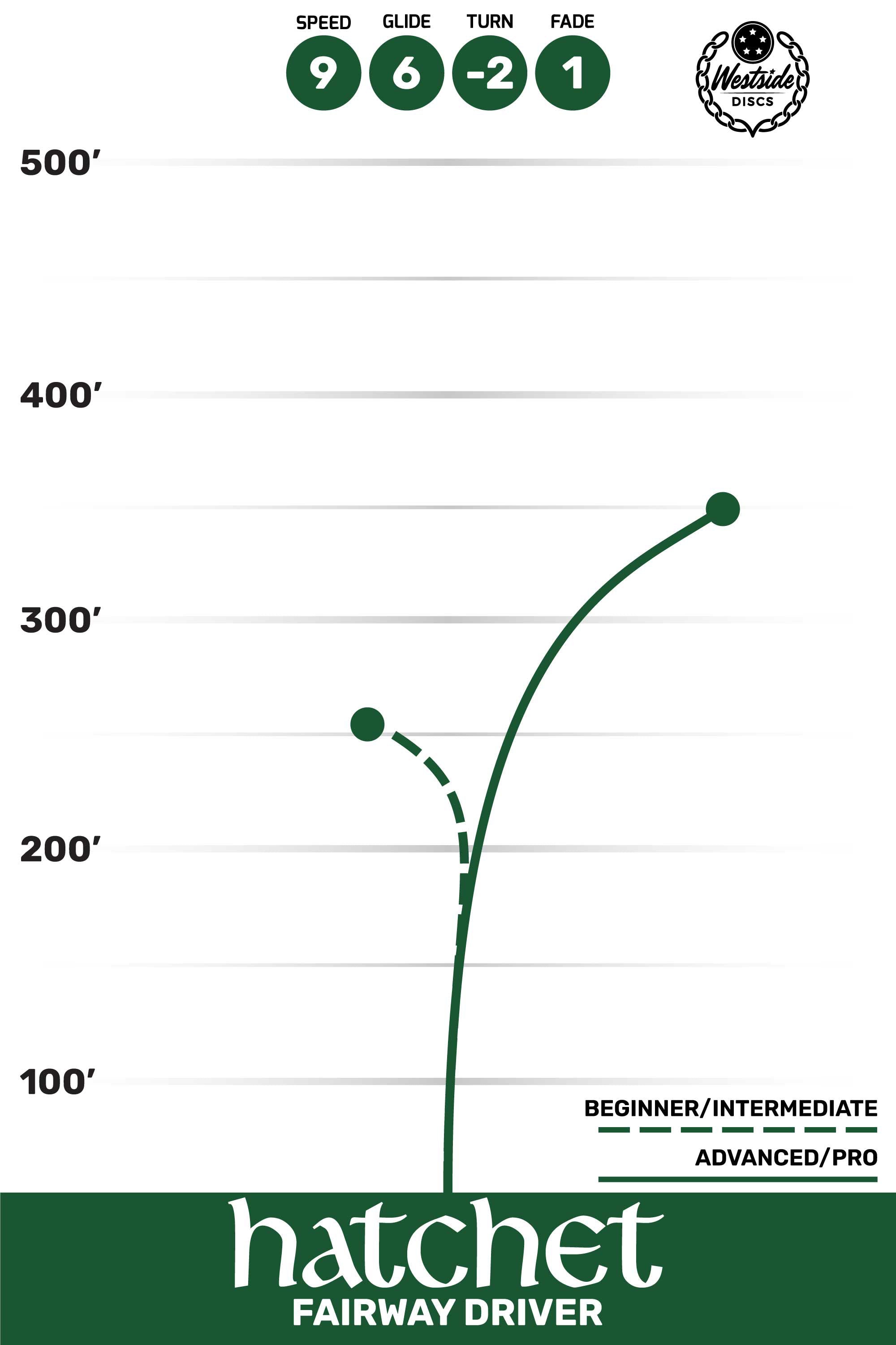 The Hatchet fits any hand and is extremely user friendly. It holds the line you put it on and is very controllable. A must have for all players the Hatchet will allow you to throw frozen rope lines. For professional players it is a controllable fairway driver that glides and can be used for rollers. For lower arm speeds, the Hatchet will glide and give you that anhyzer shot you have been missing.