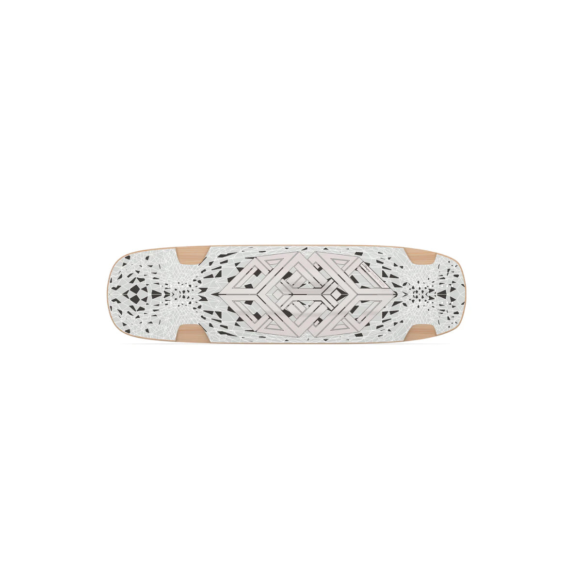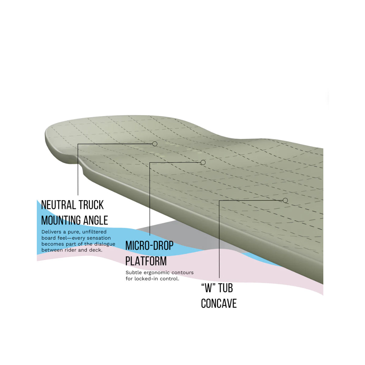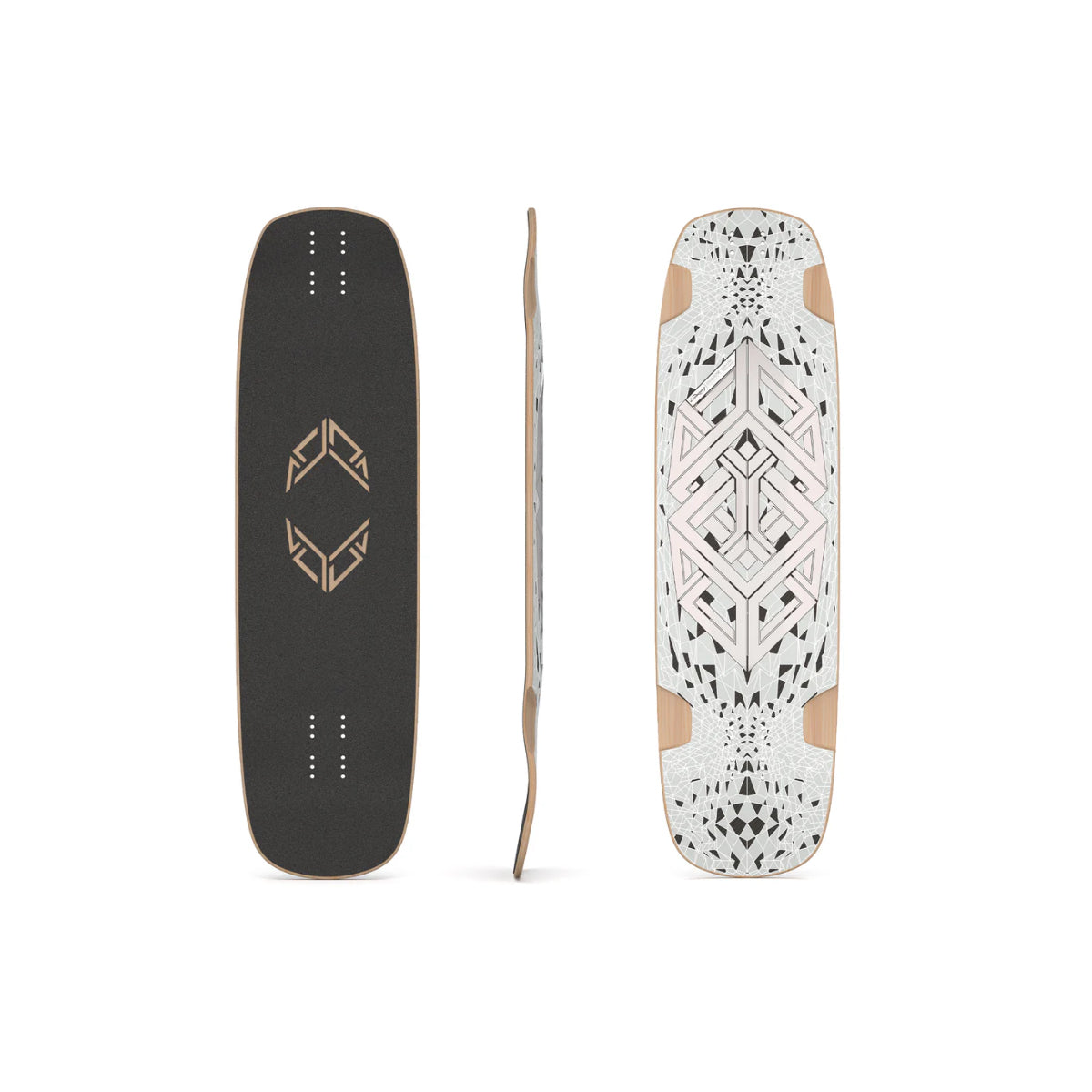 A micro-drop platform locks you in with precision, while the directional single-kick shape keeps the deck downhill focused and freeride friendly. The maple-fiberglass-basalt construction amplifies stiffness and pop. The laser-cut 50-grit griptape and machined wheel wells inspire confidence at speed. The photochromic graphic shifts with the light—an evolving reminder that you’re riding something truly one-of-a-kind.