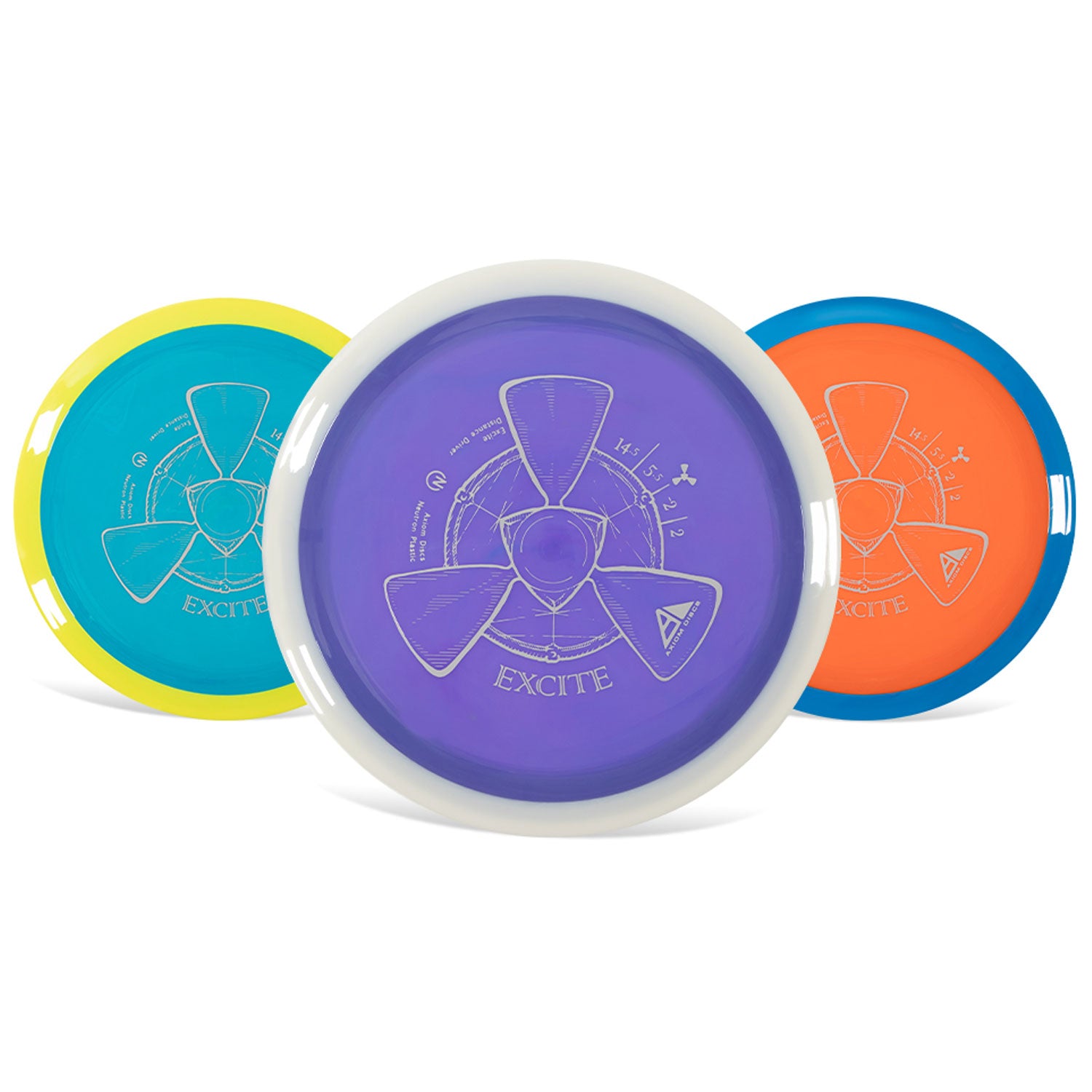 THE EXCITE IS AN UNDERSTABLE HIGH SPEED DISTANCE DRIVER. The Excite is able to achieve long accurate distance with ease from its high amount of glide and ability to hyzer-flip straight with a lower power requirement. Power throwers will be able to send this max-speed driver on huge turnover lines with a late ending fade or attack the course with high-speed rollers. The Excite’s flight characteristics emulate the Insanity, but with added speed and even more glide potential.