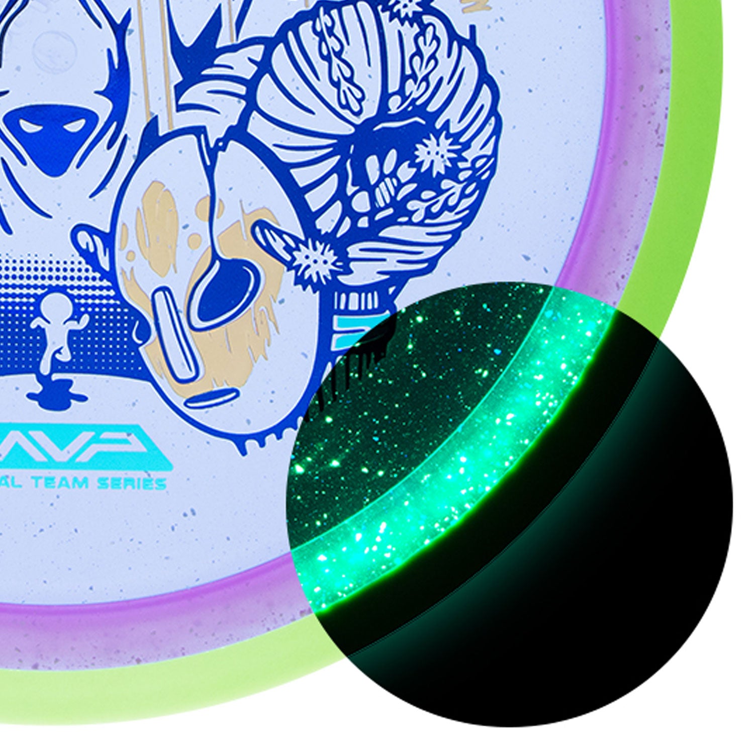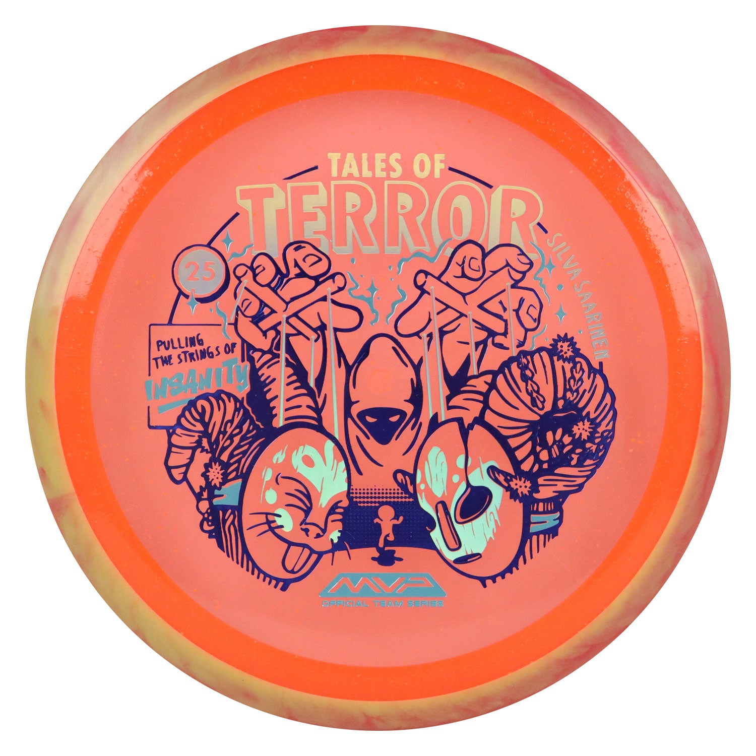 Beware the one pulling the strings during the Finnish Harvest Festival! Stamp newcomer Damian White unveils his first MVP stamp for this Halloween comic inspired design on the Particle Proton Insanity, a warning that some ornaments created for this event are a bit more ghoulish than they appear. The Insanity is a stable-understable driver that players will find easy to manipulate, with average power throws being remarkably straight with forward pushing fade, and higher power throws resulting in precise hyzer-flips, turnovers, and beautiful s-lines. Don’t let the course pull your strings - grab a Particle Proton Insanity today and prove who the true master is.