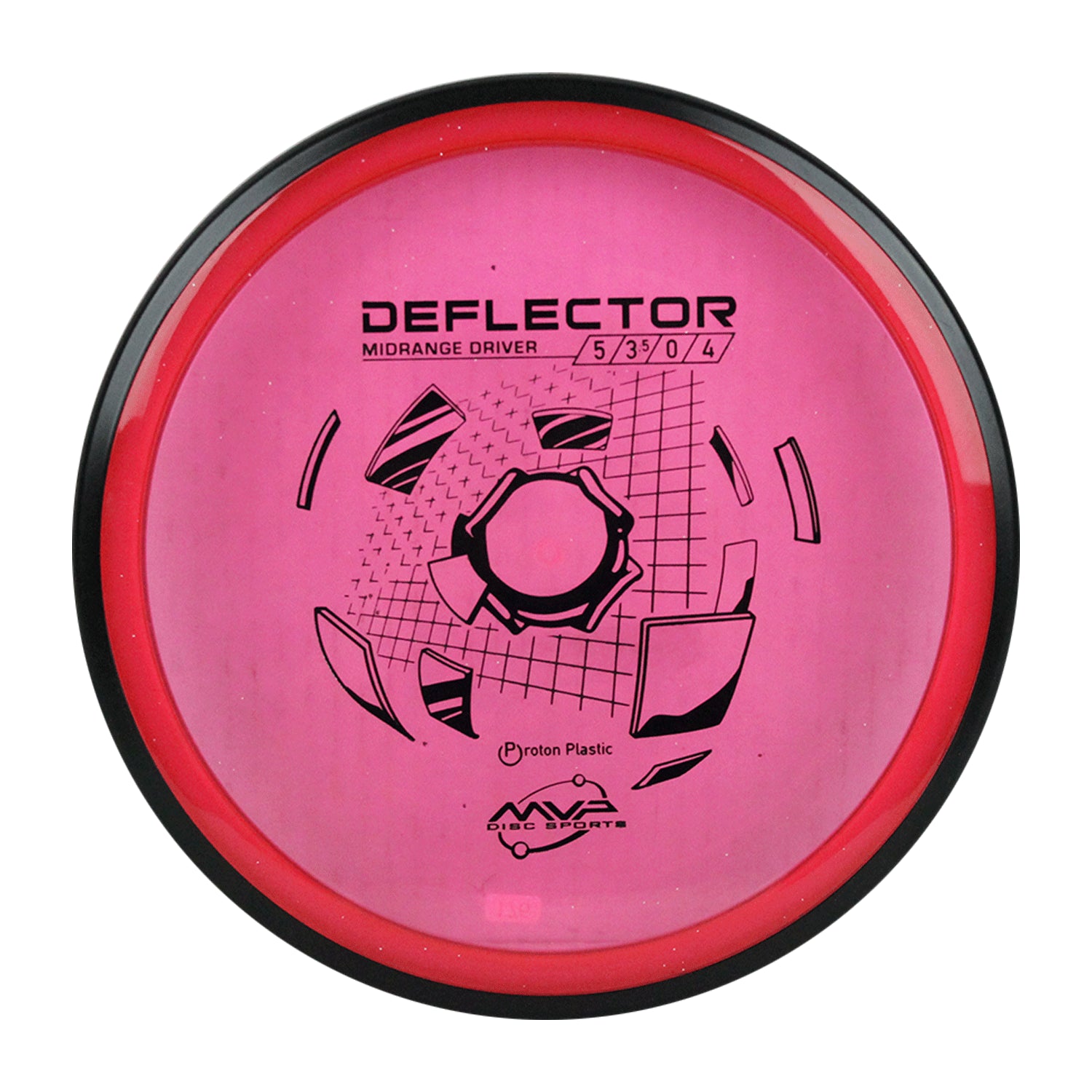 Deflector is an overstable midrange. The Deflector is here to combat headwinds and produce powerful overstable flights in all conditions. Deflector answers the call of many fans looking for a slower speed disc with powerful overstability. On an anhyzer release the Deflector will fight out of its turn and flatten out to fade. On a hyzer line the disc will follow a smooth fade with a pronounced stable finish. Our original premium plastic blend, Proton is a translucent core material with stunning optical clarity and vibrant colors. Proton has similar durability and slightly more grip than our Neutron plastic. The colorful candy plastic core yields a different aura to each model and especially suits LED-lighted night play. MVP Proton features all black GYRO rims.
