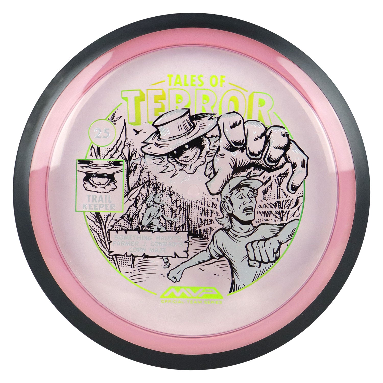 The highly requested fan favorite Proton Trail has returned! Green C Studio adorns this disc with a glimpse of the Trail Keeper haunting Conrad’s Corn Maze, a classic horror story. Excelling in hyzer-flip drives, turnovers, and straight shots, the Trail has become one of the most popular drivers in the MVP lineup that throwers of all power levels will find significant use for. You don’t have to get lost in a killer corn field to get your hands on one of these, just head over to your favorite local or online MVP dealer to get yours today!