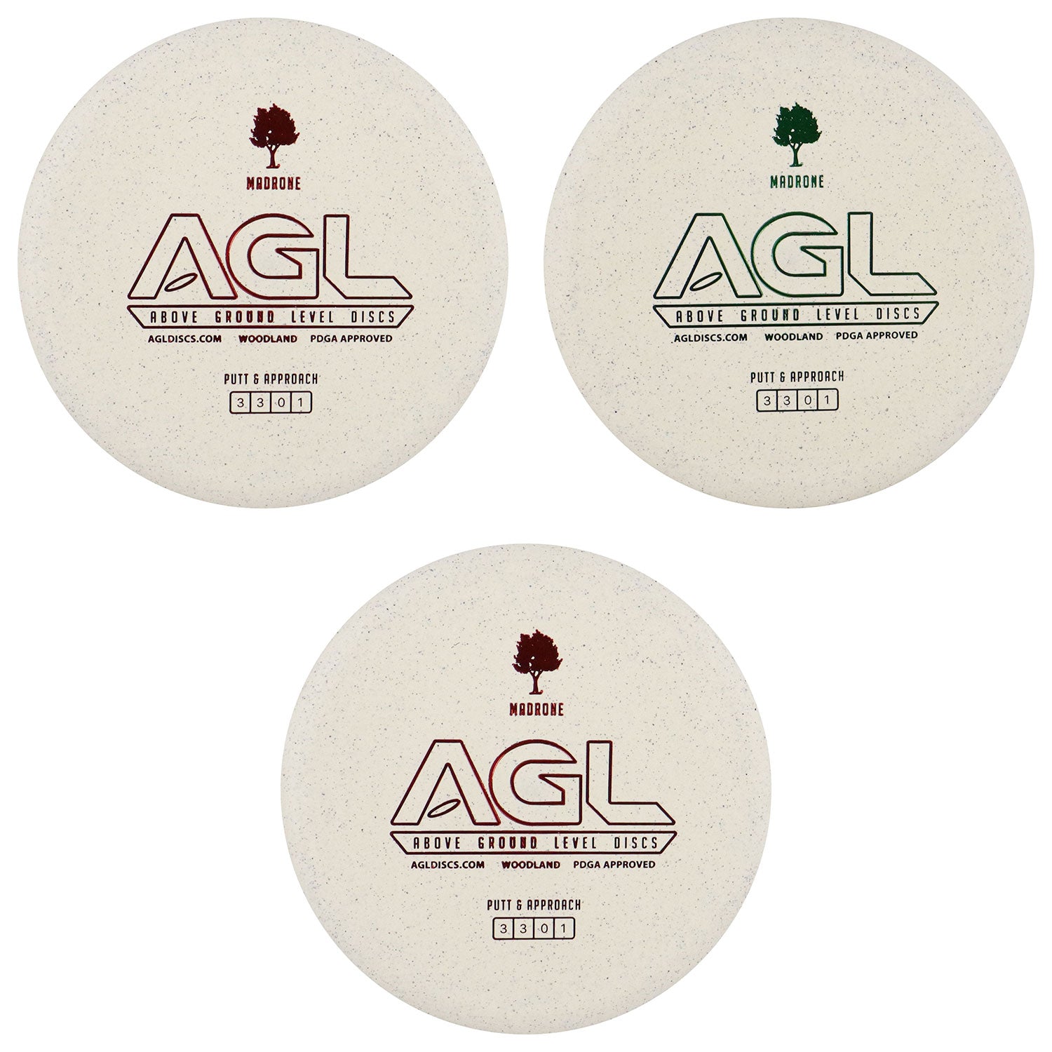 The AGL Discs Madrone is a straight flying, neutral to slightly stable, putt and approach disc golf disc with a micro-bead and a shallow thumb track. These features make this disc comfortable in the hand and give it a smooth flight with a subtle right to left finish for right handed throwers. Sporting flight numbers of 3/3/0/1 this putter has become a staple in people’s bags. This disc is torque resistant and can really handle full power off the tee for those shots where you NEED a putter, off the tee. Whether shooting approach shots or sinking those important putts the Madrone will give you the confidence you need to perform Above Ground Level.