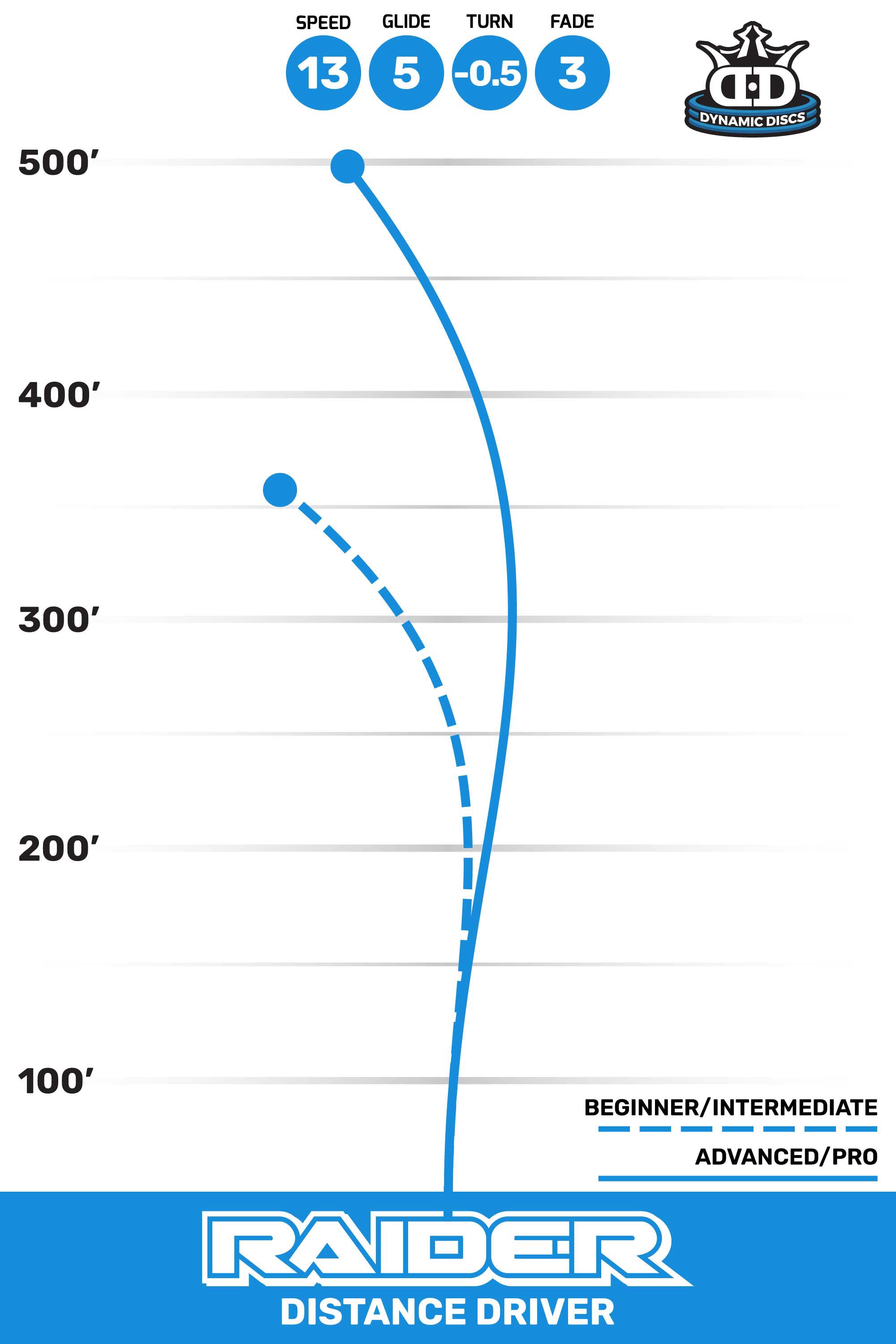 The Raider is sure to steal its spot in bags of all skill levels. The Raider sits comfortably between the Trespass and Enforcer in stability, and it excels at finishing forward instead of diving at the end of its flight. Players with slower arm speeds will find a dependable, overstable driver that will gain them distance over the Enforcer or Defender, while faster arms will love the Raider as a workhorse driver that is perfect for carrying multiples to cover a variety of shots. Get ready to put some power on your distance shots, and watch the Raider destroy your previous best drives.
