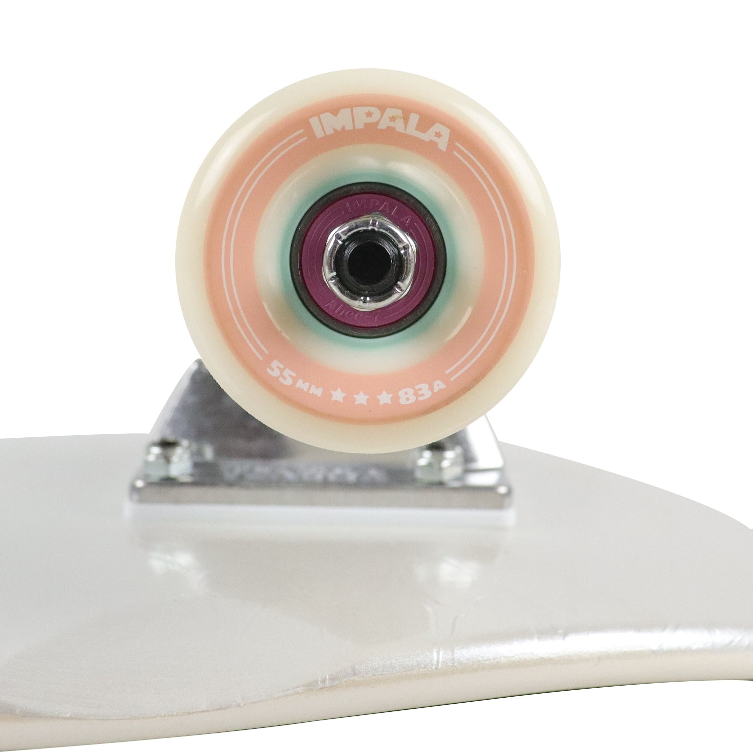 The Impala (made by Globe) Cherub White Serpent arrives ready to cruise. This complete cruiser mearings 8.15" x 29" and features Glitter griptape, and a Pearlescent snakeskin pattern bottom. Medium concave with nose and tail kick. Built with 5.0" Tensor alloy trucks, 55mm 83a street cruiser wheels, ABEC-7 Impala bearings with pink shield.