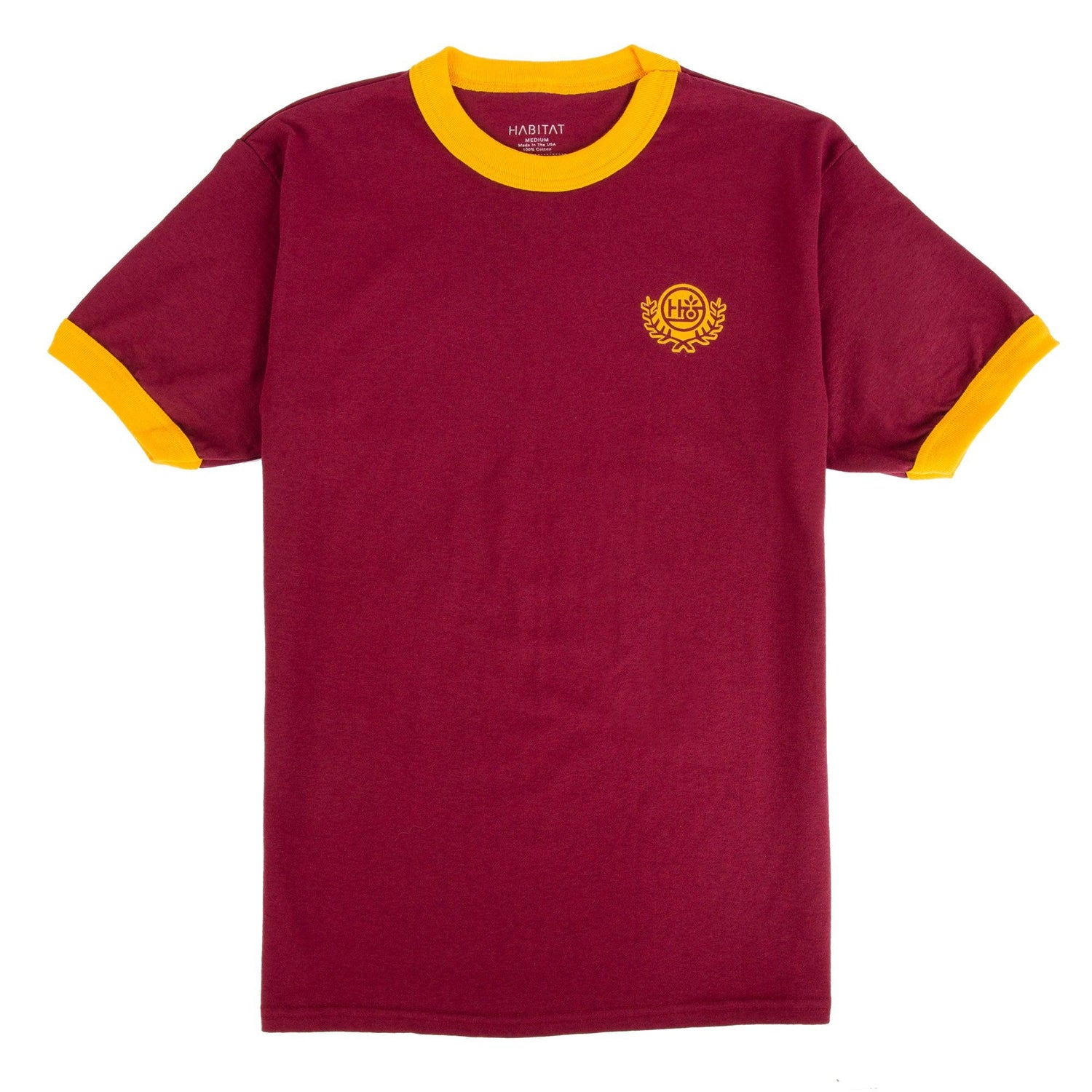 Habitat Coat of Arms logo ringer t-shirt. Contrast color sleeve and neck band. 100% cotton. Water-based screen-print left chest and back graphic.