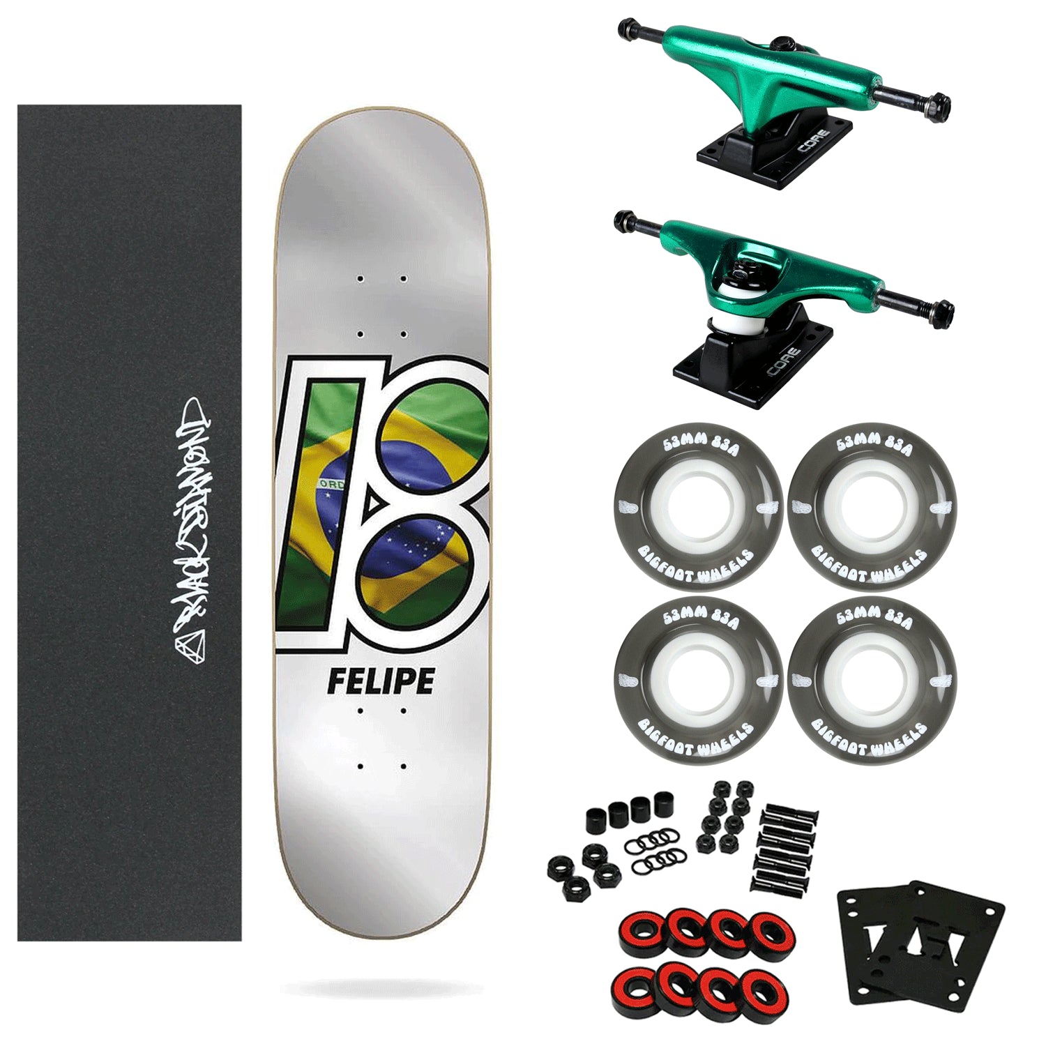 This skateboard features soft 83A wheels for an extra smooth ride. Includes the Plan B Felipe Gustavo Global Deck 7.75", Core Green 5.0 trucks, Bigfoot 53mm Black 83A Wheels, Amp Speed Bearings, 1" Hardware, and Black Diamond Griptape. Arrives un-assembled which allows for customization and a feeling of accomplishment. Skaters love building their boards! Easy to assemble!