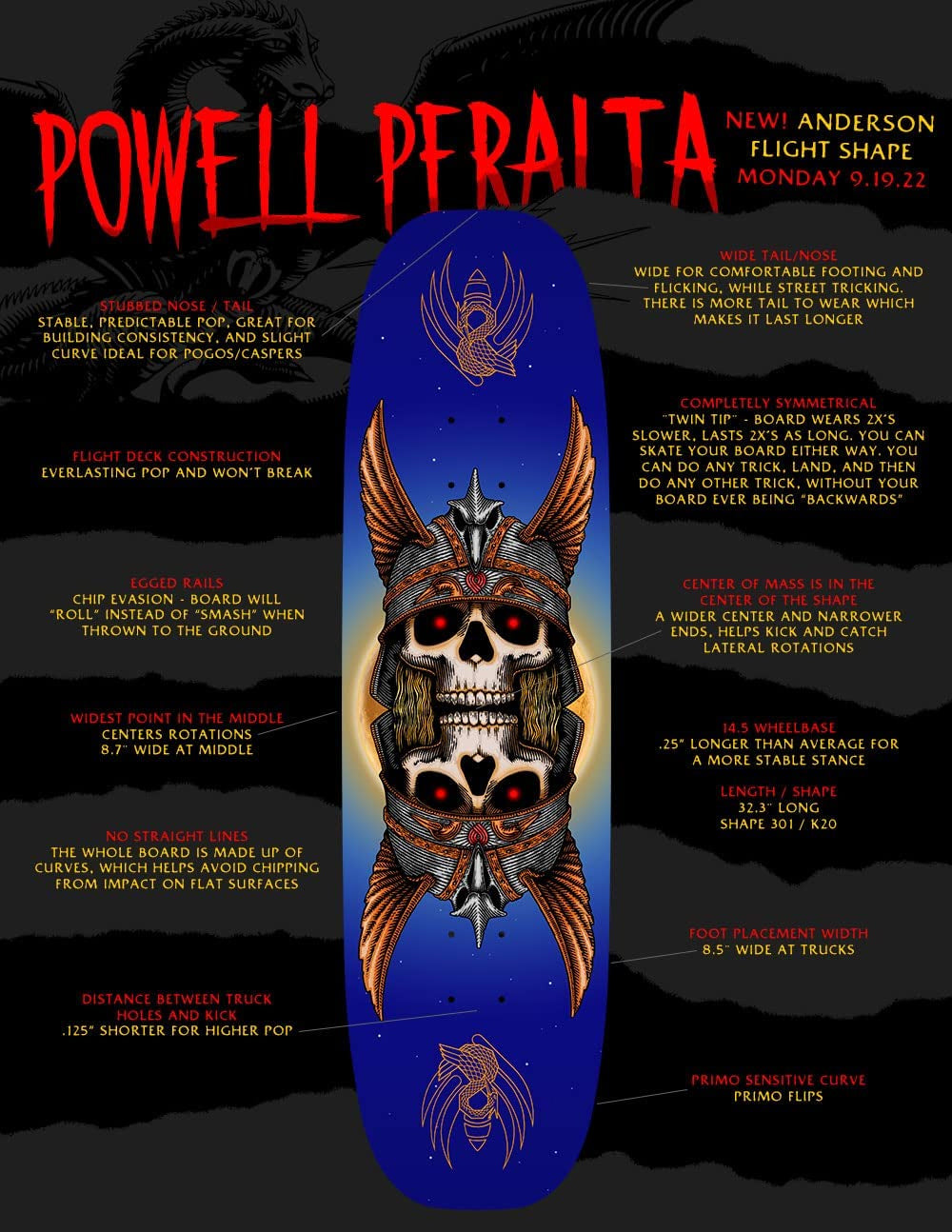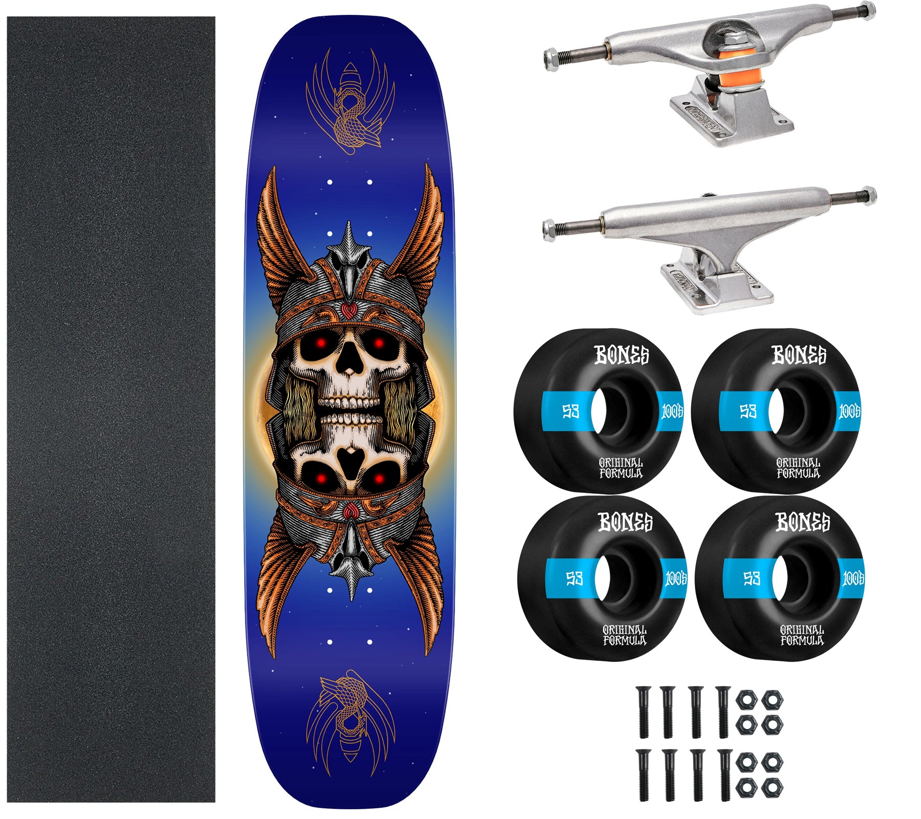 Includes everything you need to build your own premium, professional grade Powell Peralta Andy Anderson complete skateboard. The Andy Anderson Pro Flight 301 measures 8.7" x 32.3" with a 14.5" wheelbase, 6.8" nose, and 6.8" tail. Flight decks are stronger, thinner and lighter than a 7-ply. The epoxy infused, fiber reinforced structure of the Flight deck is extremely resistant to breaking, and this structure gives Flight decks "everlasting pop" that doesn't fade as your Flight deck slowly wears. Includes everything you need to build a complete. Comes with Independent Stage 11 Standard 149 (8.5") Trucks, 53mm Bones 100's Wheels, Amp Abec 5 Bearings, 1/8" Risers, 1" Phillips Hardware, and Black Diamond Griptape. Arrives un-assembled which allows for customization and a feeling of accomplishment. Skaters love building their boards! Easy to assemble!