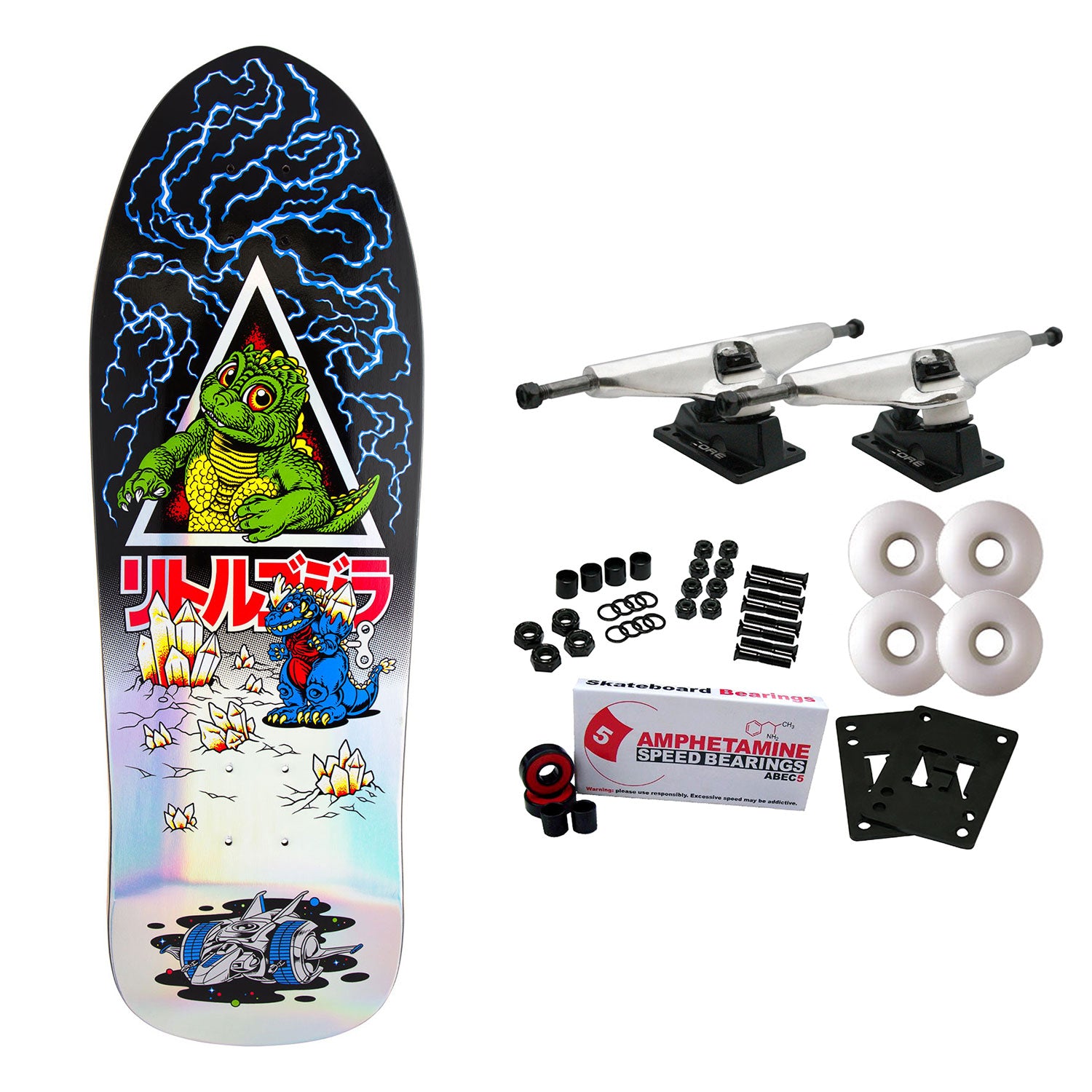 Unstoppable forces collide when the original King of the Monsters along with its legendary cast of kaiju, joins forces with Santa Cruz Skateboards to release our exclusive, officially licensed Godzilla collection. Santa Cruz Skateboards Godzilla Jr. Natas deck featuring spot matte and metallic graphics with silver primatic foil, Godzilla vs. Santa Cruz deck top graphics and laser engraved Godzilla logo. 7 ply North American Maple deck pressed individually using epoxy - making a strong, responsive deck with long lasting pop and consistent concave and kick. Cruz Missile II concave is Santa Cruz's infamous tech concave from the 1980s with aggressive, multi-dimensional side to side concave and tail kick along with forward set rocker that comfortably lock in your feet in key areas for a completely unique riding experience - cruising the streets or skating transition on old school or shaped decks with longer tail than nose. Comes with Core trucks, 58mm 97A wheels, Amp abec 5 bearings, Black Diamond Griptape, risers, and hardware. Core trucks are light weight and feature heavy duty aluminum with grade 8 steel kingpins and axles, as well as USA made bushings and pivot cups. 58mm 97A are the perfect wheels for both street and park skating. Like the name states, Amp bearings are stimulants for your wheels! Light synthetic oil, Delrin Crowns, and Rubber Serviceable Shields are a few of the things that makes these bearings one of the best Abec 5 rated bearings on the market. Arrives un-assembled which allows for customization and a feeling of accomplishment. Skaters love building their boards! Easy to assemble!