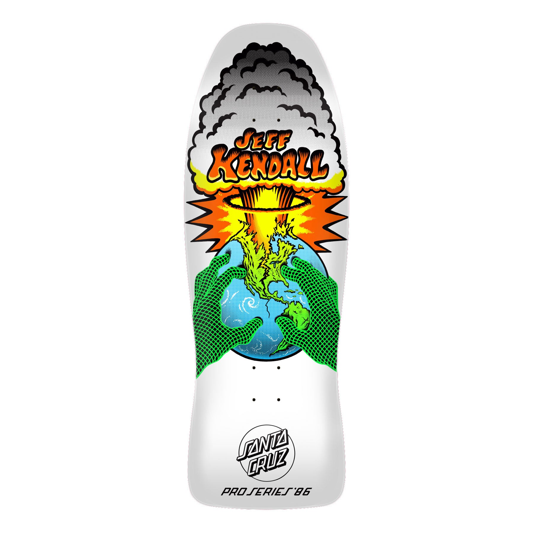 Santa Cruz Skateboards Jeff Kendall End of the World Reissue deck featuring spot matte and neon graphics on full dip white and 2025 reissue laser decktop logo. Measures 10.0" x 29.7" with a 15.875" wheelbase. 7 ply North American Maple pressed individually using epoxy - making a strong, responsive deck with long lasting pop and consistent concave and kick. Cruz Missile II concave is Santa Cruz's infamous tech concave from the 1980s with aggressive, multi-dimensional side to side concave and tail kick along with forward set rocker that comfortably lock in your feet in key areas for a completely unique riding experience - cruising the streets or skating transition on old school or shaped decks with longer tail than nose.