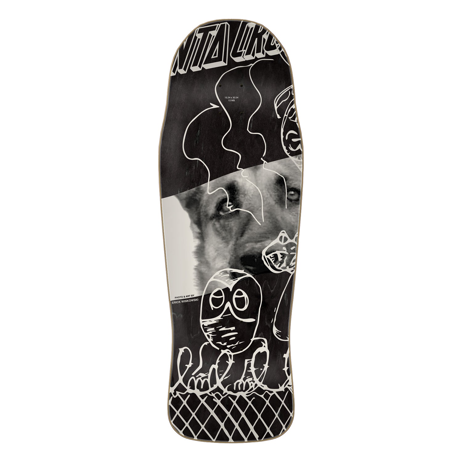The Santa Cruz Skateboards Winkowski Tribute Pro Shaped deck is a tribute to Erick's friend Georgia. Digitally printed in color on bottom and black and white on deck top. On Erick's custom shape with a 15" wheelbase. Photo and artwork by Erick Winkowski. This board measures 10.34" x 30.54" with a 15" wheelbase. 7 ply North American Maple pressed individually using epoxy - making a strong, responsive deck with long lasting pop and consistent concave and kick. Cruz Missile II concave is Santa Cruz's infamous tech concave from the 1980s with aggressive, multi-dimensional side to side concave and tail kick along with forward set rocker that comfortably lock in your feet in key areas for a completely unique riding experience - cruising the streets or skating transition on old school or shaped decks with longer tail than nose.