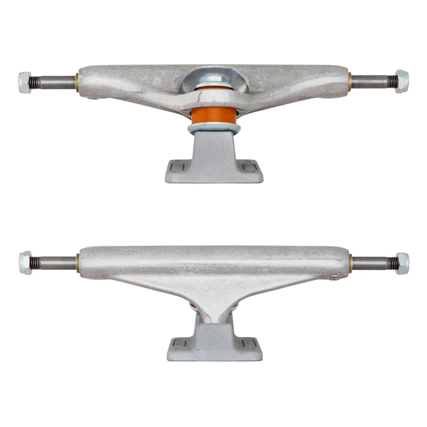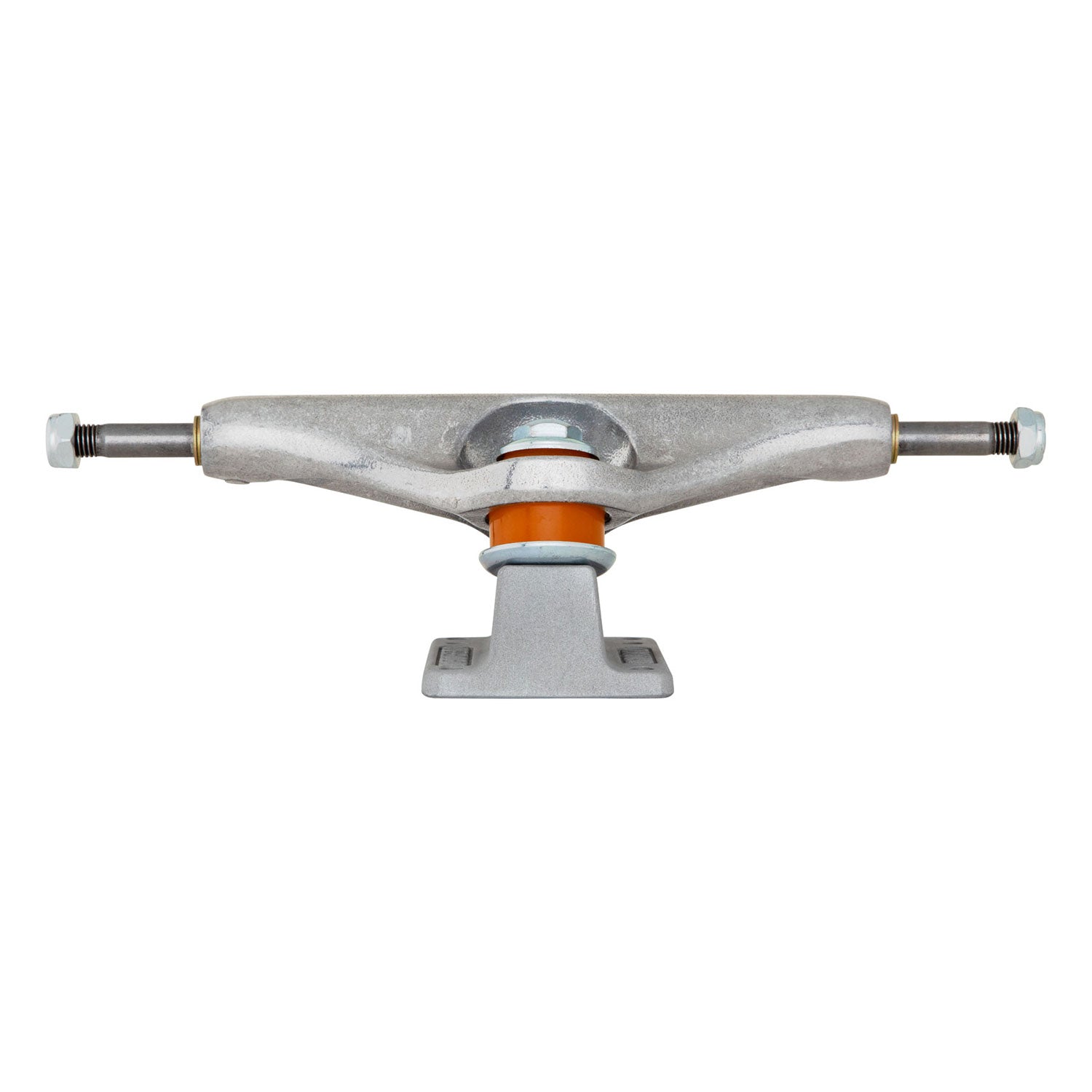 Independent Trucks Industrial 2 Stage 11 IKP with newly improved inverted kingpin features polished silver hanger with media blasted baseplate, and orange cushions.