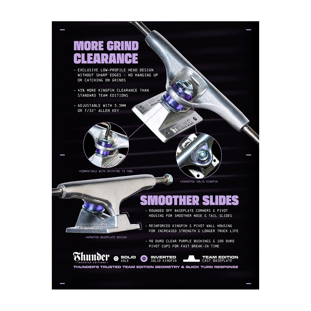 Thunder Inverted Edition Trucks feature team edition geometry for quick turn response, developed for those looking for more grind clearance and smoother slides.