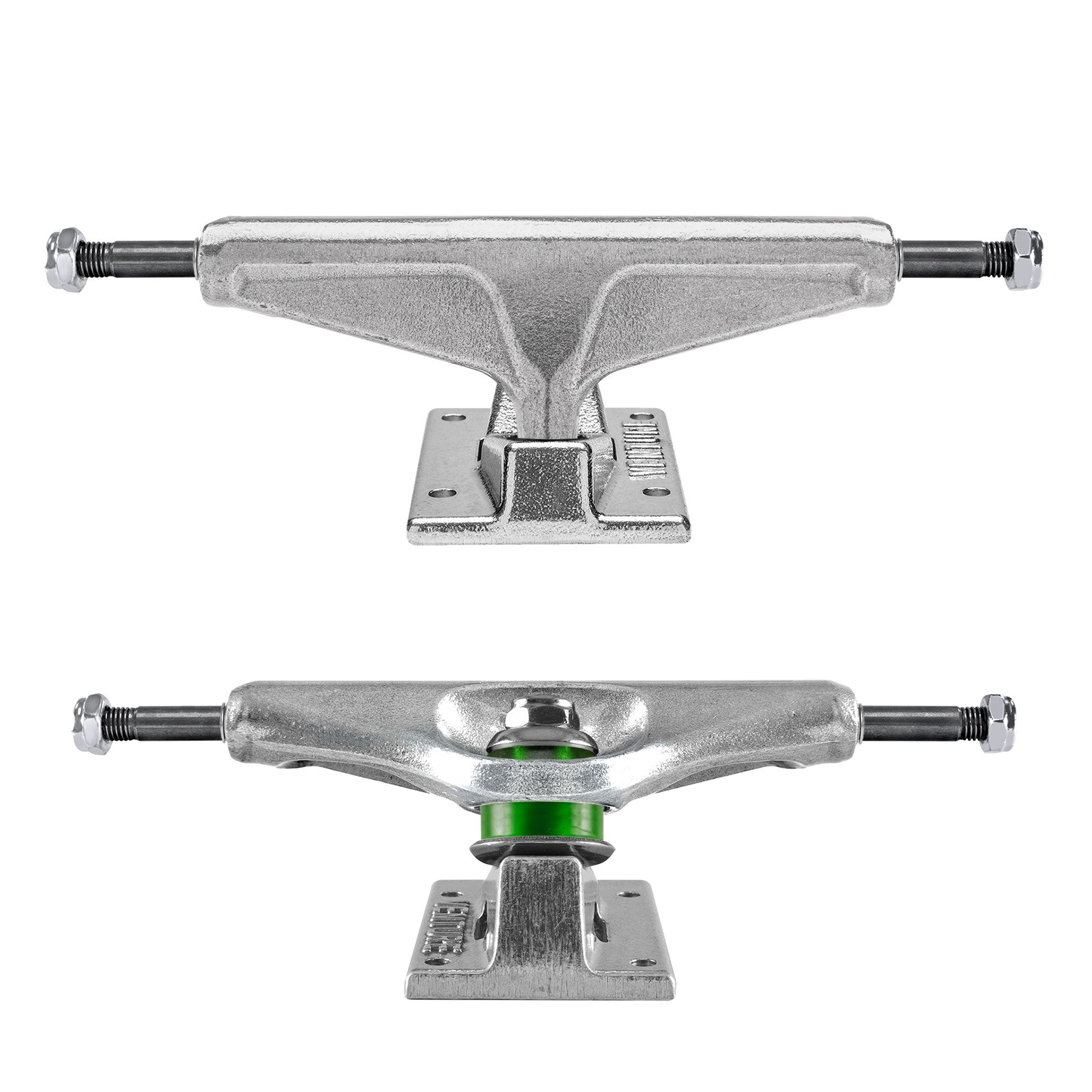 A new concept for a legacy brand in skateboarding. Venture pioneered the high/low truck design and they are at it again with team editions loos trucks. Finally, a truck specifically designed for… loosers? Venture loose trucks come with shorter stock top bushings to give your trucks more room to skate loose. Featuring a polished silver hanger and baseplate with clear green 90A bushings. Venture 6.1 = 8.75" Axle. Includes 2 Trucks.