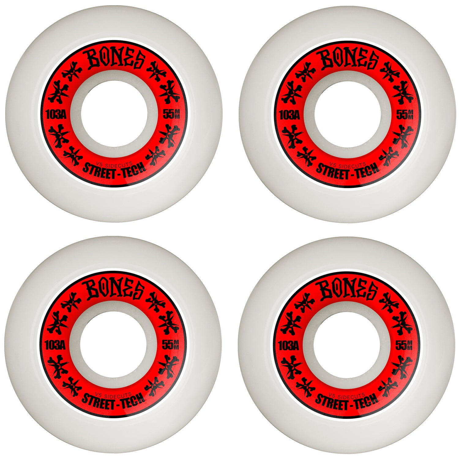 Bones Street Tech Formula 103A wheels in the V5 Sidecut shape. This shape is tuned for skating ledges, rails and bowls, featuring a centerset reversible bearing seat. This shape is versatile, lighter weight, less slide drag, faster longer grinds, high resistance to flatspots, graphic protection.