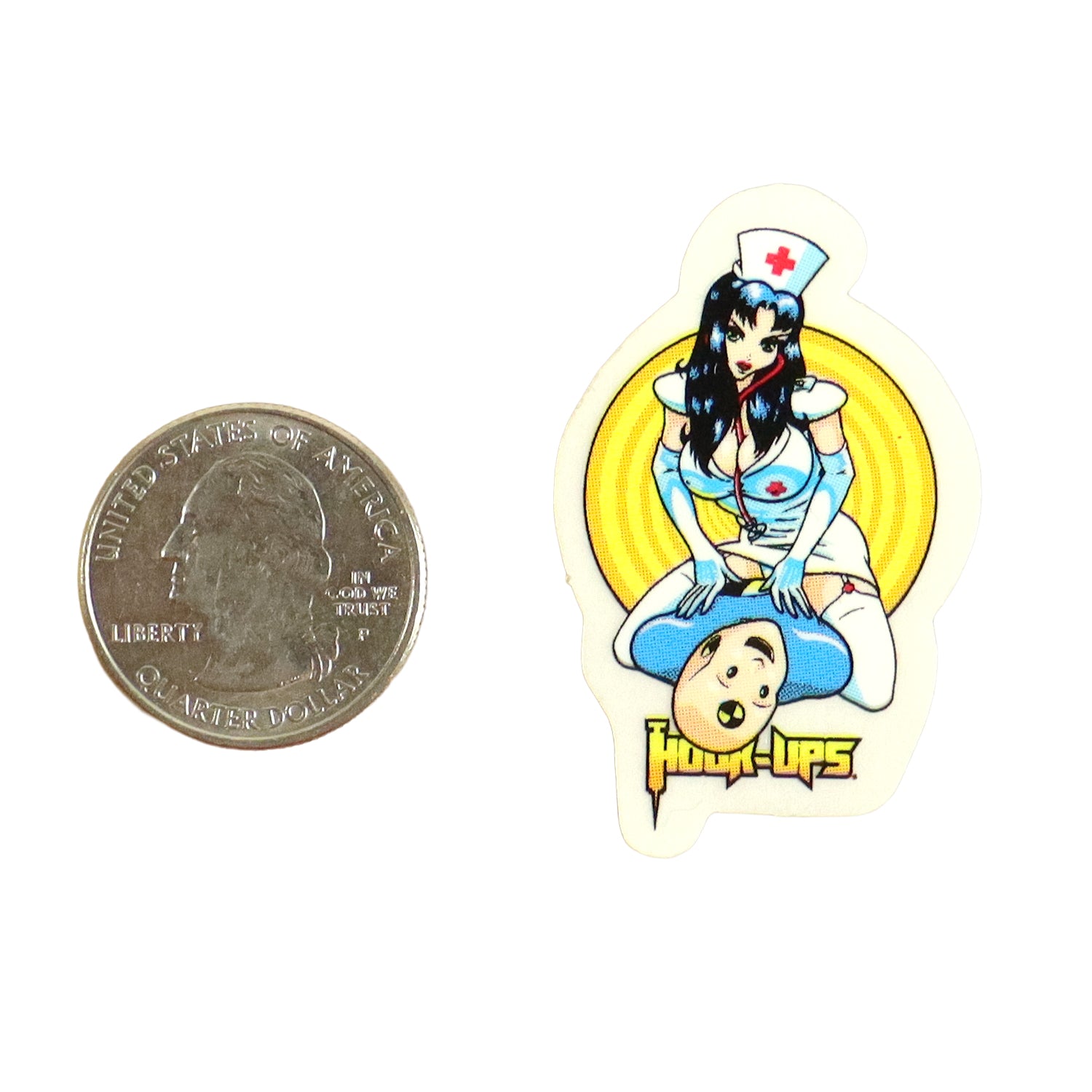 *Please note the size of this sticker* Quarter for scale, NOT INCLUDED. Premium quality mini size sticker from Hook Ups Skateboards. Perfect for phones, dashboards, laptops, etc.