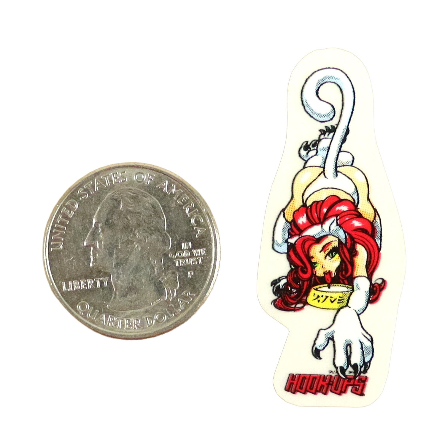 *Please note the size of this sticker* Quarter for scale, NOT INCLUDED. Premium quality mini size sticker from Hook Ups Skateboards. Perfect for phones, dashboards, laptops, etc.
