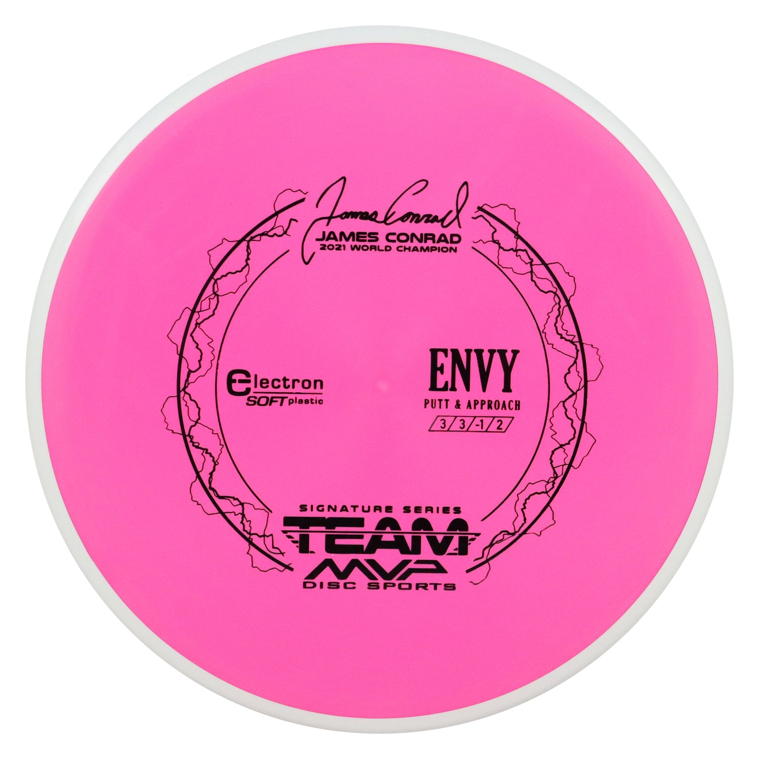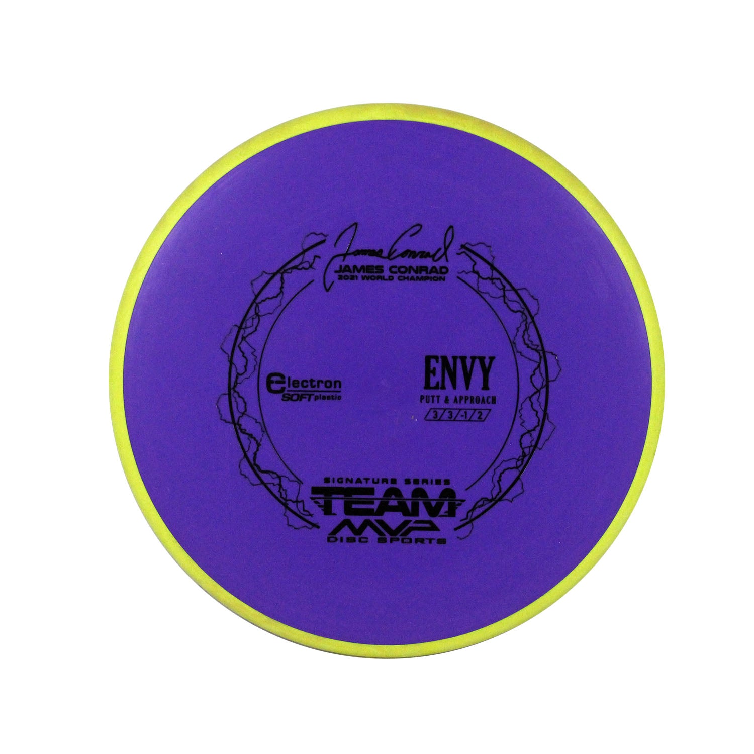 The best driving putter in disc golf is now forever linked with the best putter thrower in disc golf, and we wouldn’t have it any other way. The first James Conrad Signature Series disc, the Envy in Electron plastic, provides the grip and confidence needed for greatness. The Envy has a smooth modern feel that fits in the hand perfectly, lending confidence for both putt and approach duties. The Envy exhibits reliable high-speed stability and a minimal fade. With a slightly lower profile and cruising speed than the Ion and Anode class, the Envy is a uniquely “lid-like” stable putter.