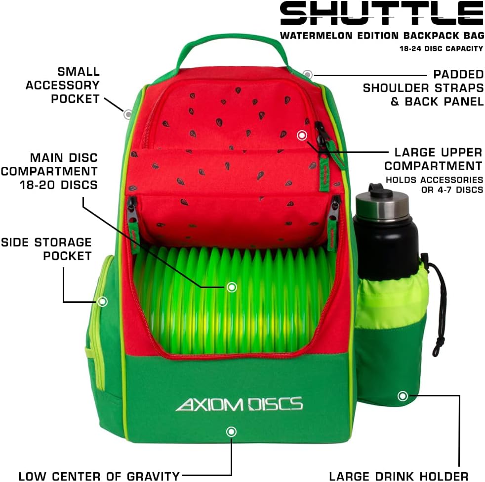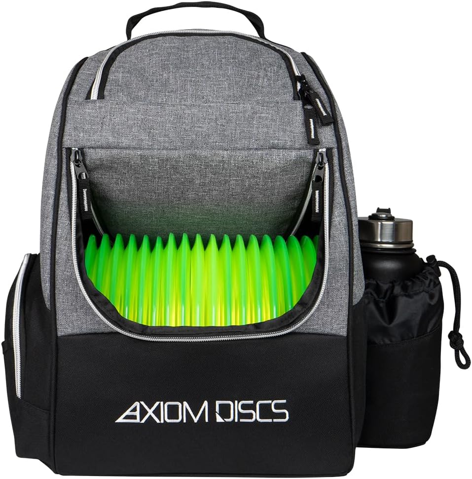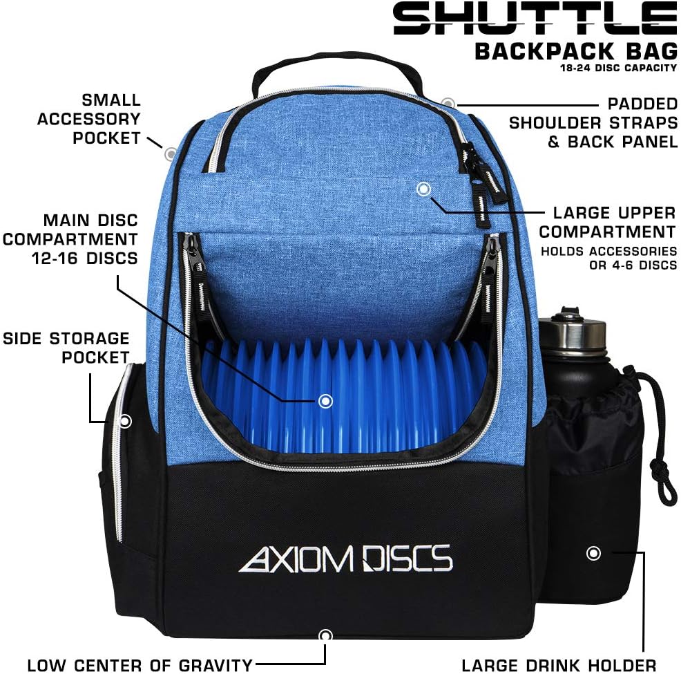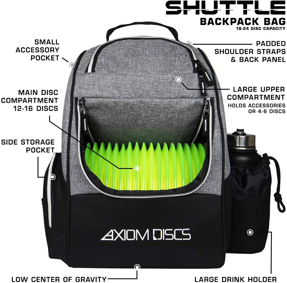 The Axiom Shuttle Bag is perfect for quick rounds or making the move to a backpack style bag to expand your options out on course, and a perfect complement to the wildly popular MVP Shuttle. The main compartment is designed to hold 12-16 discs, the side pocket is capable of holding up to 4 discs, and the top pocket is able to hold 2 discs and your accessories, or up to 6 additional discs. The Axiom Shuttle Bag also has a side panel pocket, larger side pocket storage, a standard large drink holder, and adjustable padded straps for comfortable wear for players of all sizes. Features: Huge 18-24 Disc Capacity, Upper Pocket for More Discs or Accessories, Side Panel Pockets for Additional Storage, Lightweight and Durable Materials, Adjustable Padded Shoulder Straps, Embroidered Axiom and Icon Logo. Does NOT include discs or watter bottle.