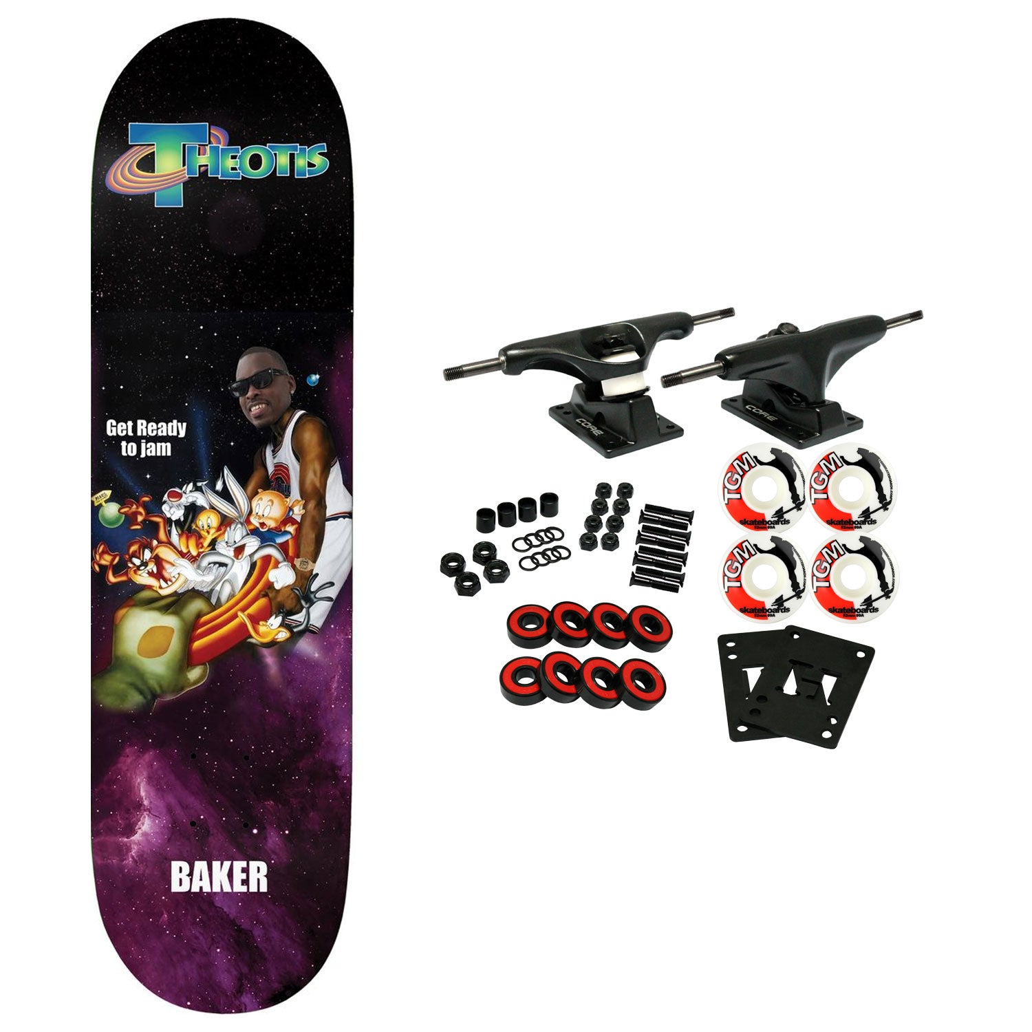 Baker Skateboard Decks are constructed with premium 7-Ply North American Maple. This board measures 8.25" x 31.875" with a 14.25" wheelbase. Comes with Core trucks, 52mm TGM logo wheels, Amp abec 5 bearings, Black Diamond Griptape, risers, and hardware. Core trucks are light weight and feature heavy duty aluminum with grade 8 steel kingpins and axles, as well as USA made bushings and pivot cups. 52mm 99A are the perfect wheels for both street and park skating. Like the name states, Amp bearings are stimulants for your wheels! Light synthetic oil, Delrin Crowns, and Rubber Serviceable Shields are a few of the things that makes these bearings one of the best Abec 5 rated bearings on the market. Arrives un-assembled which allows for customization and a feeling of accomplishment. Skaters love building their boards! Easy to assemble!