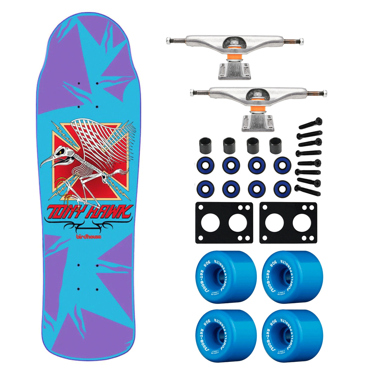 This is a professionally curated Tony Hawk complete skateboard that features the Birdhouse Tony Hawk Artifact 9.5” Deck, Independent 169 Silver Trucks, and Powell Peralta 60mm Rat Bones Wheels. Also includes Black Diamond griptape, Bullseye 7 Bearings, Dimebag hardware and risers. Arrives unassembled so you can put it together with custom specs.