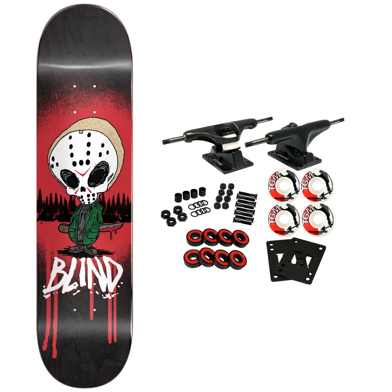 Resin-7 Canadian Maple Construction. 7-ply 100% Canadian Maple with Epoxy Resin Glue. Single Deck Press (Same shape and concave every time). The Blind Reaper Horror Rogers Deck Measures 8.0" Wide. Comes with Core trucks, 52mm TGM logo wheels, Amp abec 5 bearings, Black Diamond Griptape, risers, and hardware. Core trucks are light weight and feature heavy duty aluminum with grade 8 steel kingpins and axles, as well as USA made bushings and pivot cups. 52mm 99A are the perfect wheels for both street and park skating. Like the name states, Amp bearings are stimulants for your wheels! Light synthetic oil, Delrin Crowns, and Rubber Serviceable Shields are a few of the things that makes these bearings one of the best Abec 5 rated bearings on the market. Arrives un-assembled which allows for customization and a feeling of accomplishment. Skaters love building their boards! Easy to assemble!