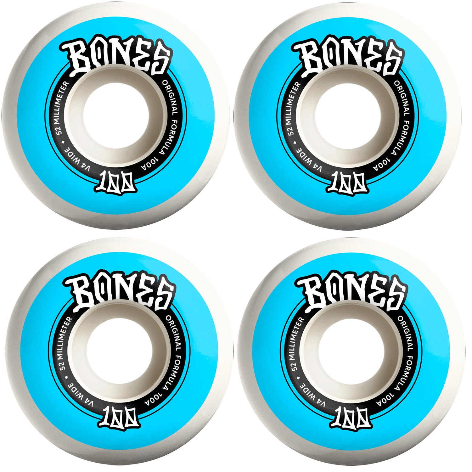 These Bones wheels feature the V4 Wide shape, poured with the original 100A formula. These Wheels Measure 52mm x 34mm. The V4 wide shape has a wider contact patch for greater stability and solid landings.