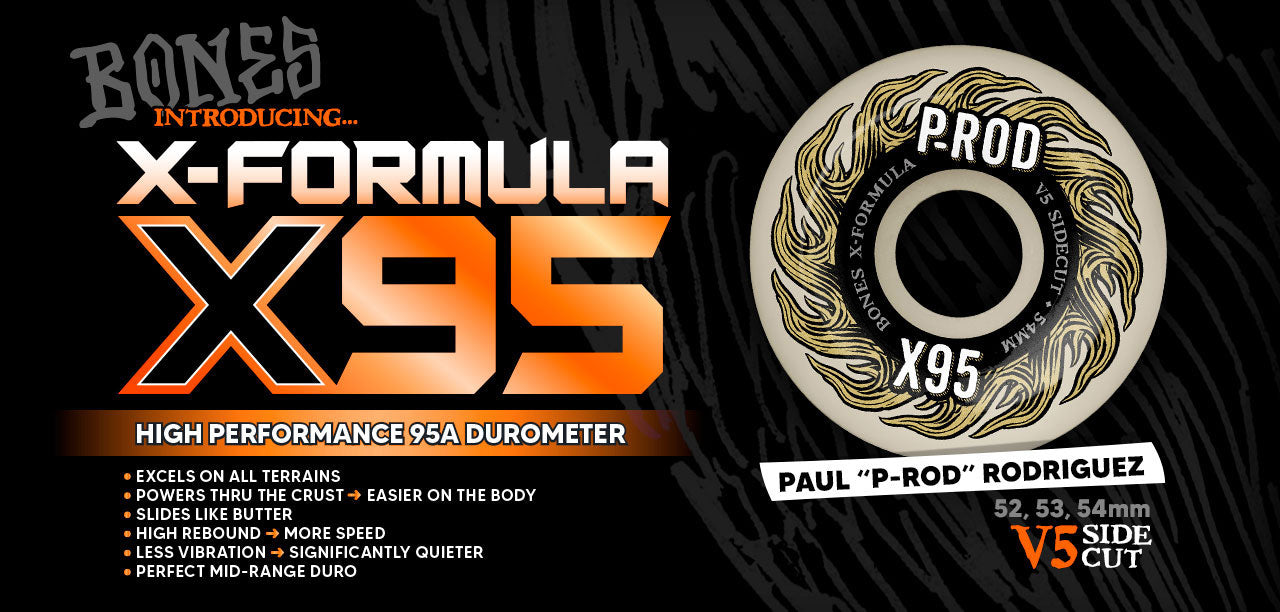 X-Formula (XF) is another industry leading innovation from the Bones Wheels factory. X-Formula rolls over rough terrain like softer wheels do, but slides much like a harder wheel will. X-Formula rolls much smoother and faster on all terrains because it absorbs vibration and softens impacts much better than any other wheel in the market. The slide-ability comes from its unique blend of high performance materials. X-Formula will slide when you ask it to, and grip when you need it most. This is because X-Formula is specially formulated for any terrain. It has been developed over a ten year period to optimize performance and fine tuned to perfection.