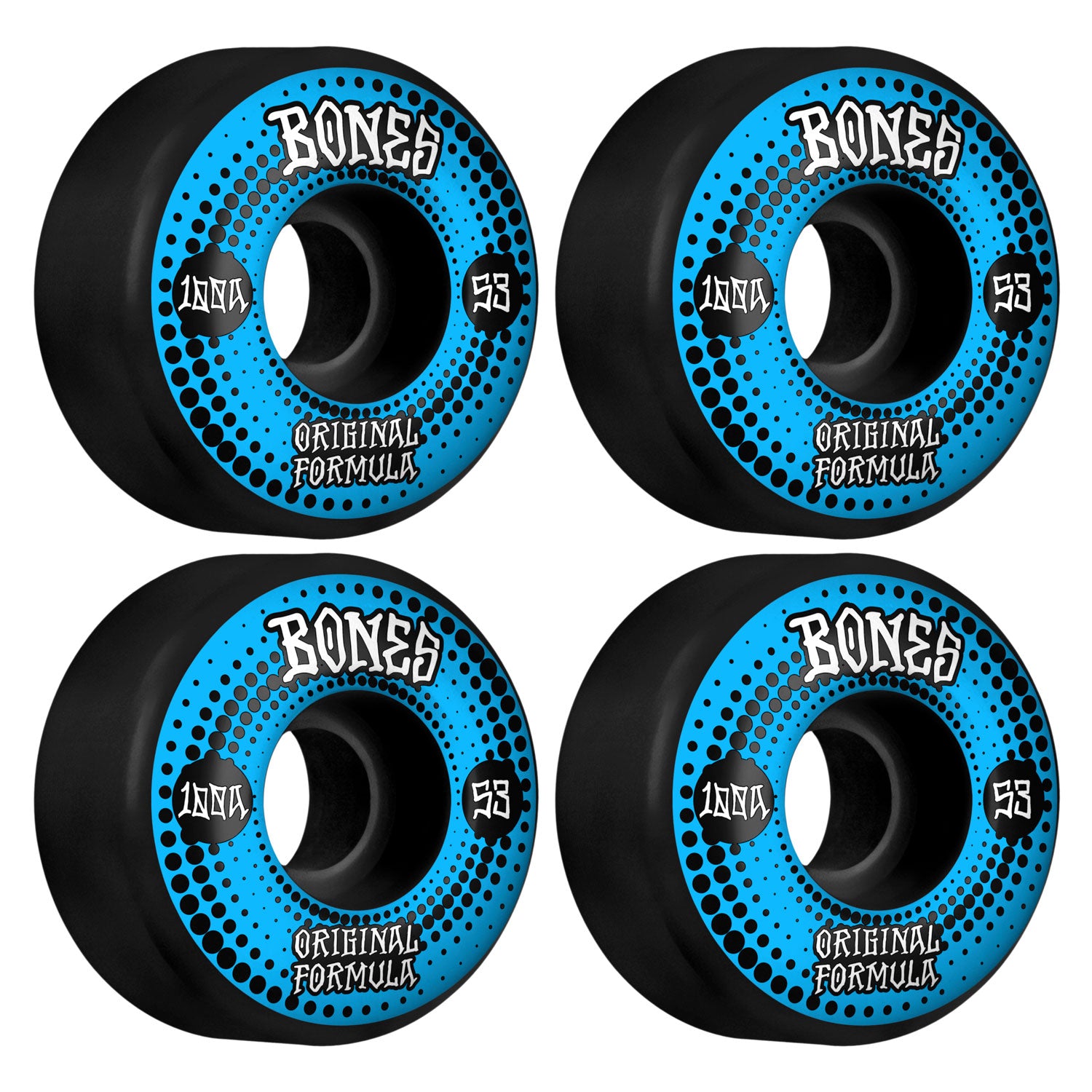 These Bones wheels feature the V4 Wide shape, poured with the original 100A formula. These Wheels Measure 53mm x 34mm. The V4 wide shape has a wider contact patch for greater stability and solid landings.