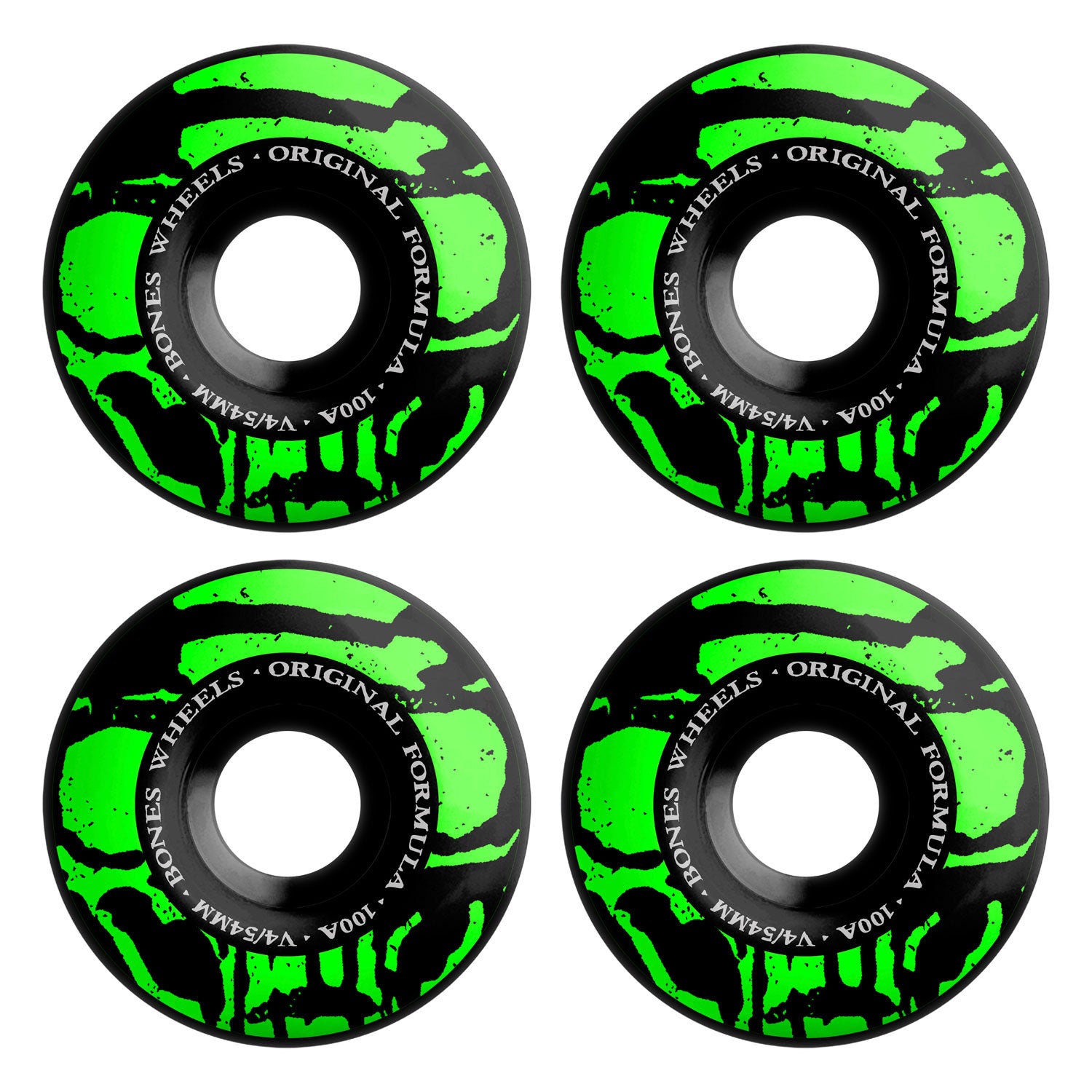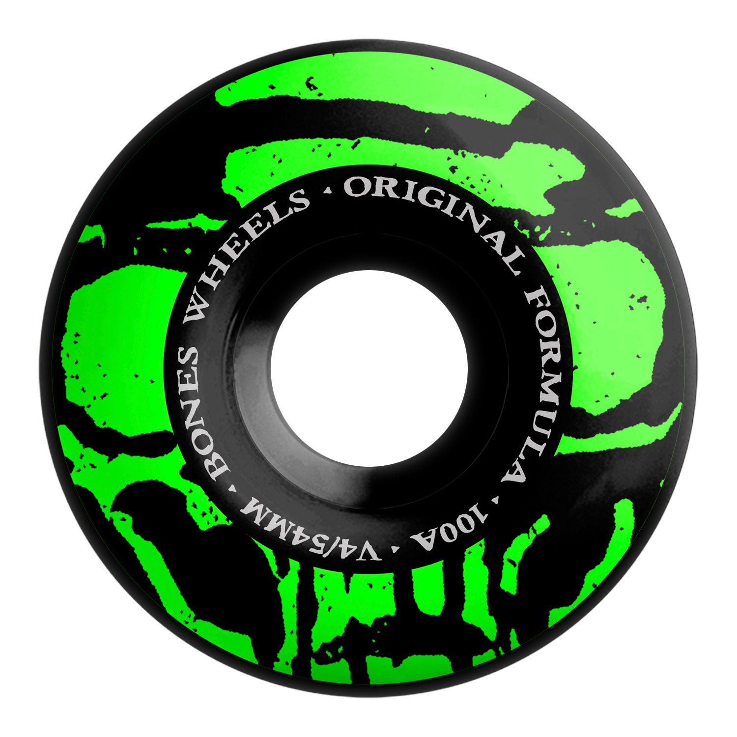 These Bones wheels feature the V4 Wide shape, poured with the original 100A formula. These Wheels Measure 54mm x 34mm. The V4 wide shape has a wider contact patch for greater stability and solid landings.