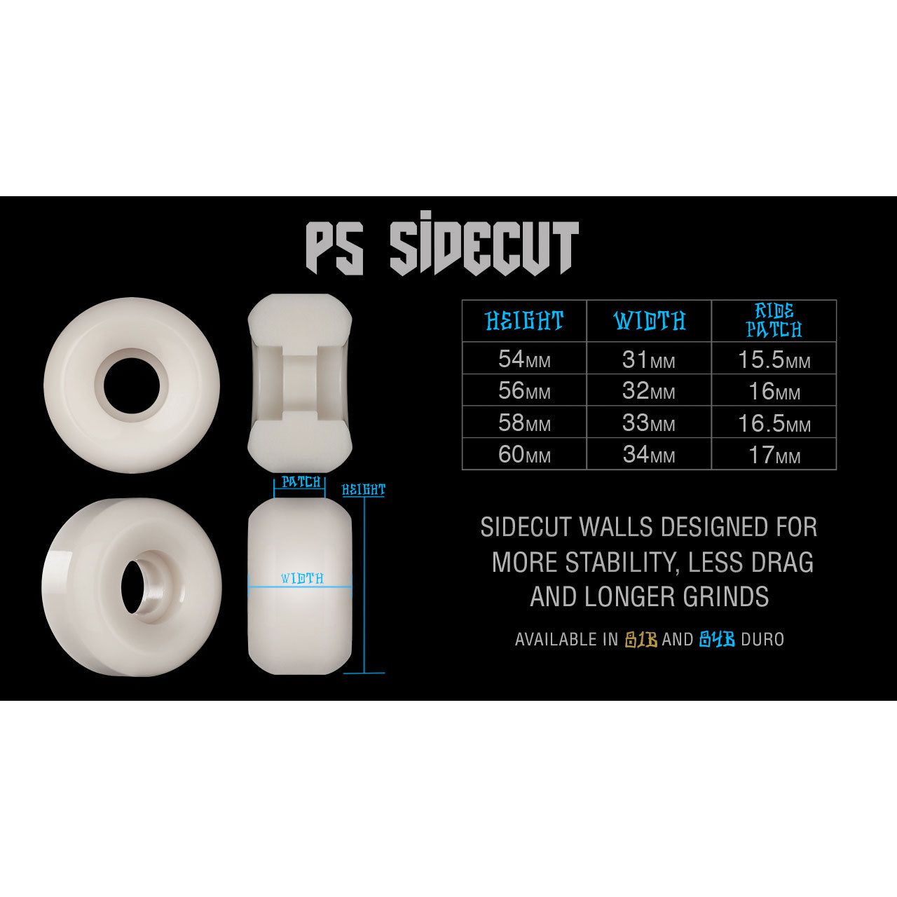 These wheels measure 54mm x 31mm on the P5 Sidecut shape in 81B Durometer. 81B is roughly equivalent to 101A.
