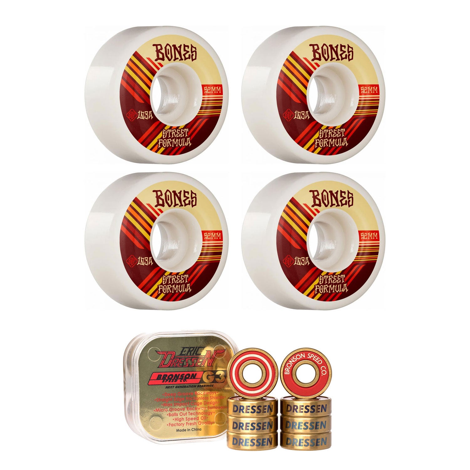 BEARINGS: Eric Dressen Signature Bronson G3: Featuring a striking metallic gold and red colorway with Dressen laser etching for added style and authenticity.