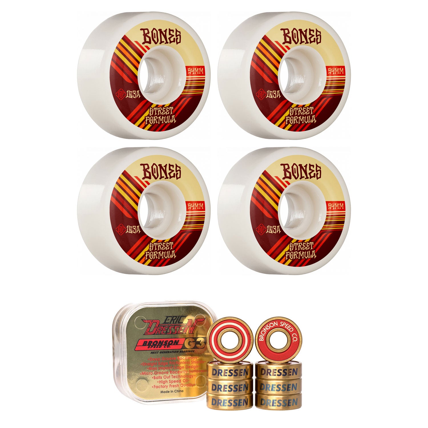 BEARINGS: Eric Dressen Signature Bronson G3: Featuring a striking metallic gold and red colorway with Dressen laser etching for added style and authenticity.