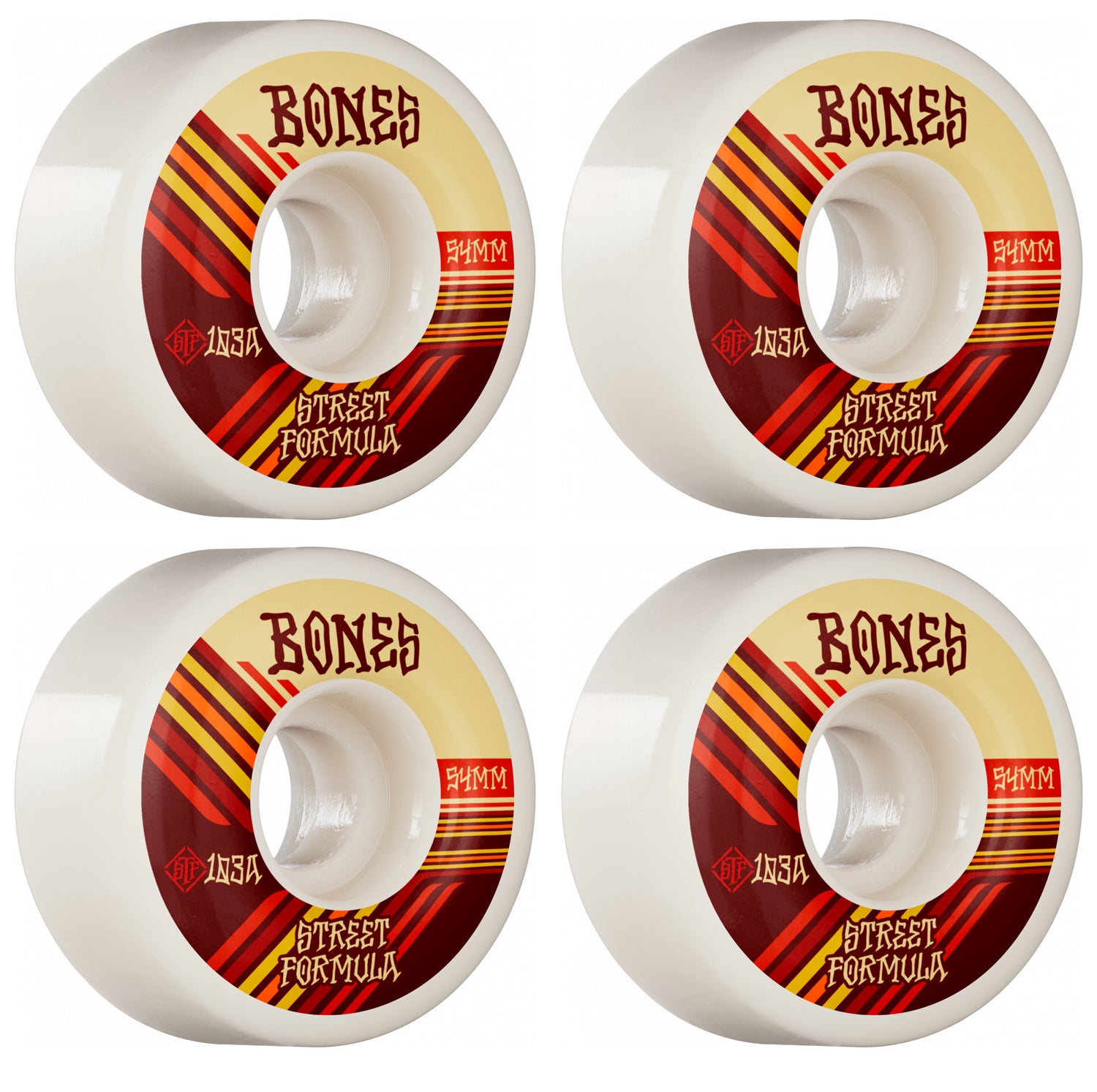 These Bones wheels feature the V4 Wide shape. 54mm x 34mm, 103A. Bones Street Tech Formula powers the legendary Bones STF wheels that roll fast, grip when you need to and slide when you want to, without flat spotting. STF gives you more control to skate with confidence. Bones STF wheels outperform all other wheels, and because they wear so well, they last several times longer than normal wheels, making STF wheels the best for less.