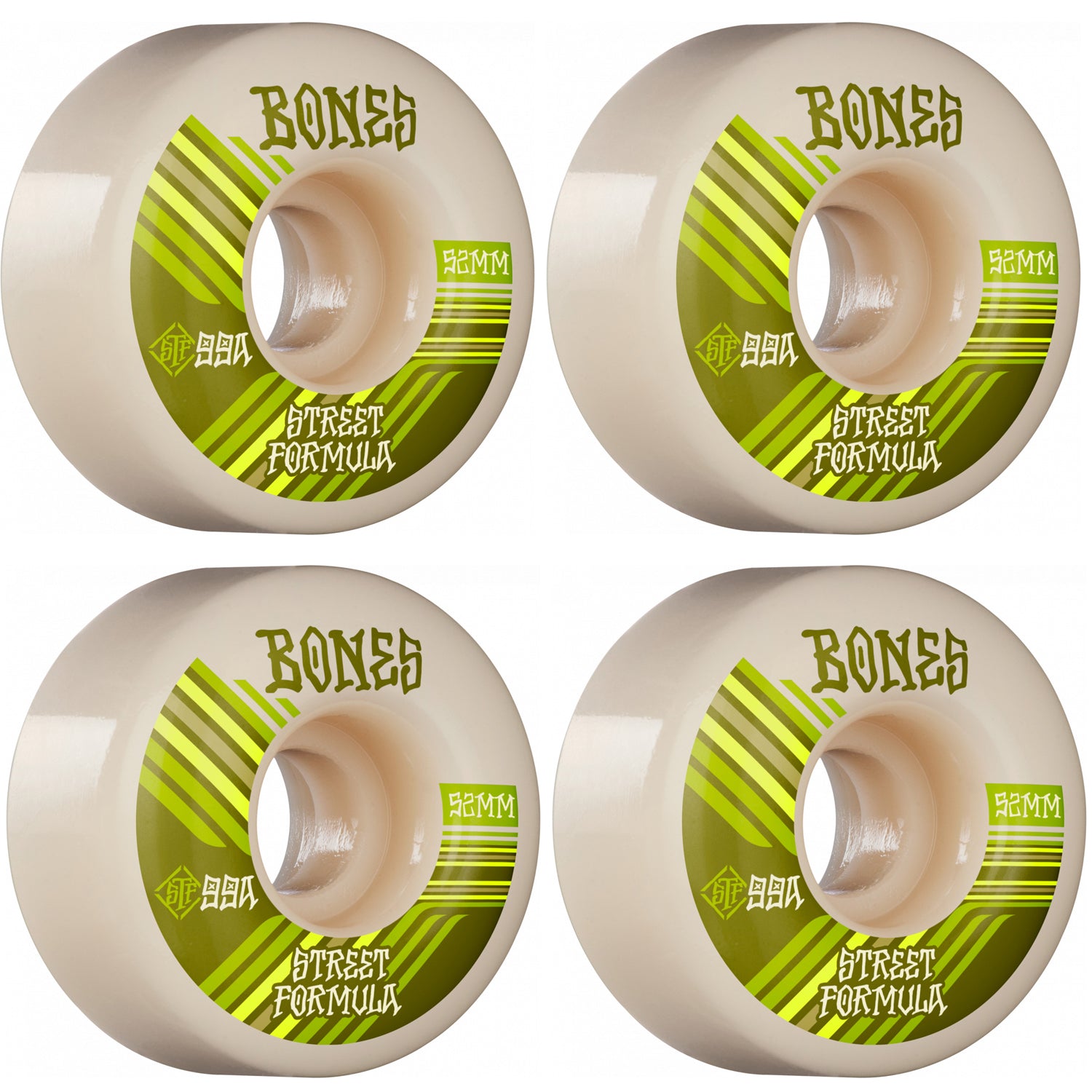 These Bones wheels feature the V4 Wide shape. 52mm x 34mm, 99A. Bones Street Tech Formula powers the legendary Bones STF wheels that roll fast, grip when you need to and slide when you want to, without flat spotting. STF gives you more control to skate with confidence. Bones STF wheels outperform all other wheels, and because they wear so well, they last several times longer than normal wheels, making STF wheels the best for less.