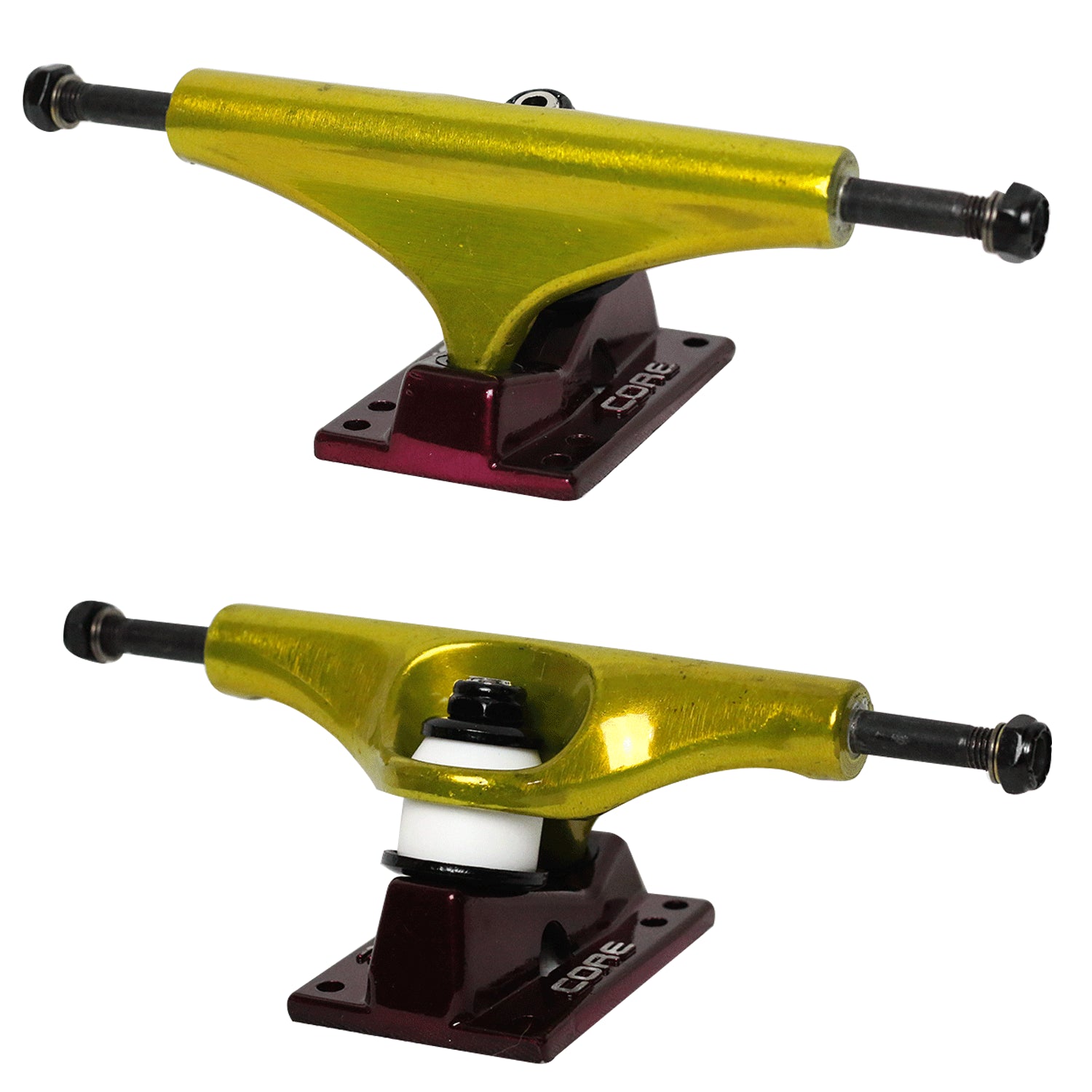 Core Trucks have offered more than 20 years of satisfactory performance and remain the top performing truck for skaters on a budget who don’t want to sacrifice quality. Now venturing into weight saving technology, these core trucks offer hollow kingpins which simultaneously lower the weight of the truck while increasing strength and performance. Featuring hollow body kingpins, lightweight aluminum alloy hangers, heavy duty baseplates, and premium USA Made Bushings and Pivot Cups. Super high rebound (SHR) bushings and pivot cups offer a responsive, smooth, and consistent ride. All Core Trucks are assembled in the USA. Size 5.25 - 8.0" Axle Length - Fits Decks 7.75" - 8.25".