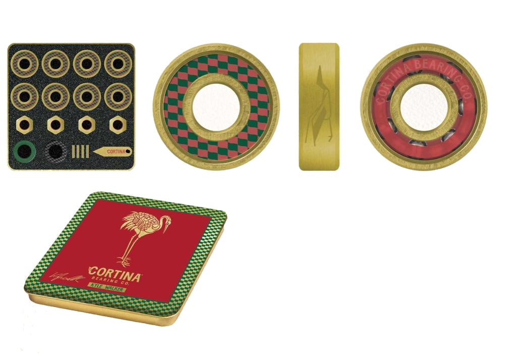 Cortina signature series bearings are built with premium material and engineered to withstand daily, heavy use. Kyle’s set is a stand-out gold colorway that includes high performance skateboard bearings, matching axle nuts and washers, interchangeable shields, shield popper for easy customization, stickers. Engineered for performance, designed for luxury.