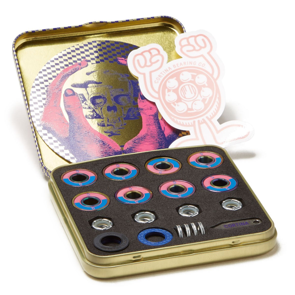 Cortina signature series bearings are built with premium material and engineered to withstand daily, heavy use. Tristian's set is a unique petrol colorway that includes high performance skateboard bearings, matching axle nuts and washers, interchangeable shields, shield popper for easy customization, and stickers. Engineered for performance, designed for luxury.