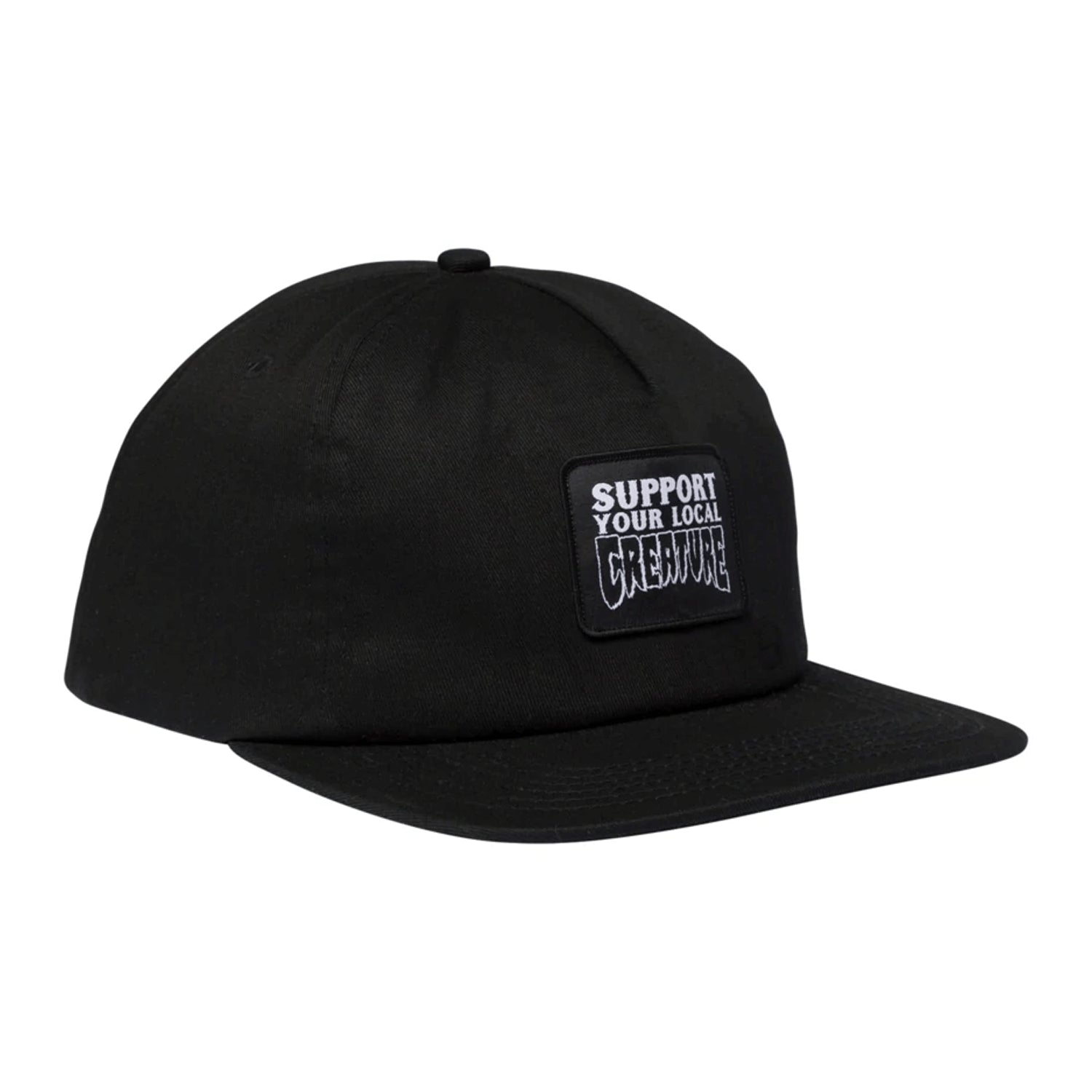 Unleash your inner fiend in the latest hats and headwear from Creature Skateboards. The Support Patch men's mid profile 5 panel unstructured snapback hat features woven label Support Patch with merrowed edges, loop label at rear snapback adjuster and custom interior taping. Creature Skateboards - Lurk with us.