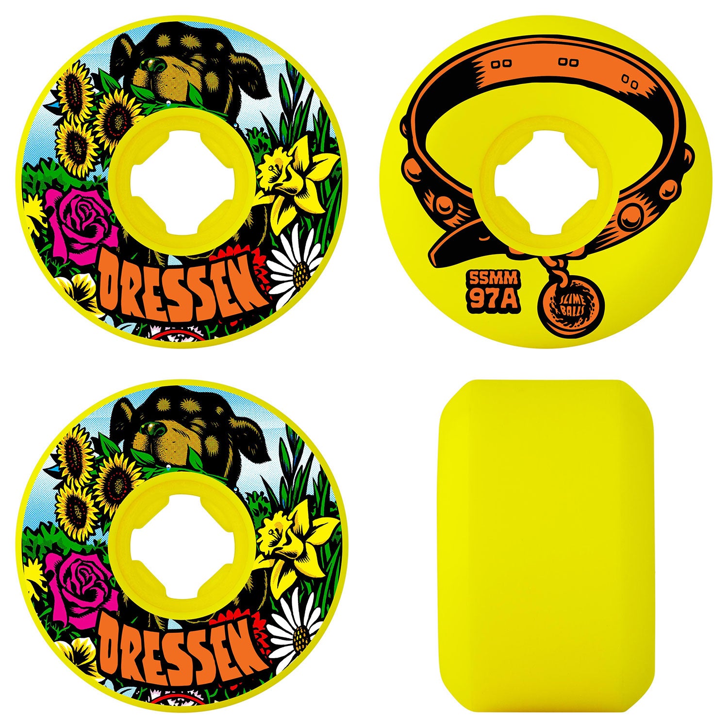 WHEELS: Slime Balls 55mm, 97a Eric Dressen Pup Reissue Hardline wheels featuring updated hardline shape and Santa Cruz graphics originally drawn by Jim Phillips Hardline shapes feature a wide road surface for stability and consistent slide with a hard edge and conical cut for controlled tricks on coping and edges. 55mm x 35mm, 97A.