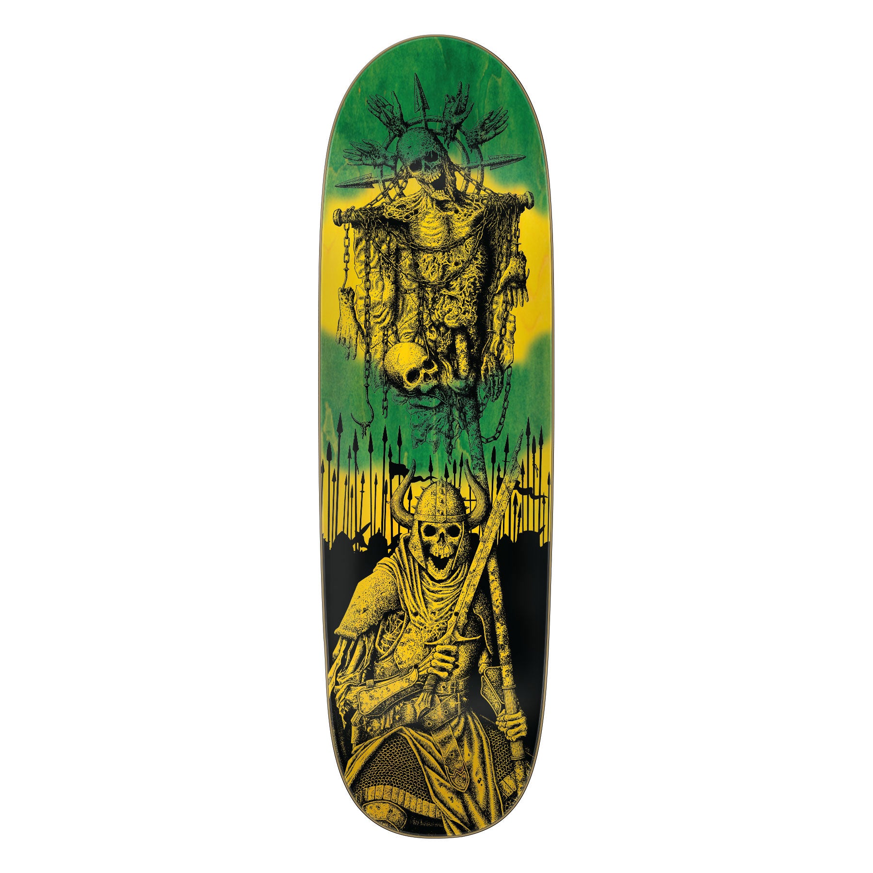 Heel to the Battle Flags of the new Messenger Pro Series featuring our battle-tested VX Eternal Destruction construction and 2 color hand stained veneer. Victory over the living awaits - art by Paul Parker. Team Messenger VX - 9.25" x 31.95" - 14" WB (Egg shape). VX decks are thinner, stronger, and have more pop than standard 7 ply decks featuring 5 plies of North American Maple and 2 layers of Quad X technology. ATV is a universal medium-depth concave with symmetrical nose and tail kick that performs well in all terrains on a wide variety of shapes - for anybody, anywhere.