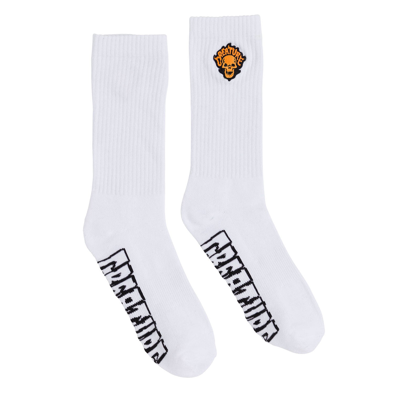 Keep it head to toe Creach' in the latest socks and apparel accessories from Creature Skateboards. The Creature Bonehead Flame crew sock features arch support ribbing, tie-dye cloud wash on Green Wash colorway, Creature Bonehead Flame embroidery on outward upper leg and Creature logo knit-in on bottom of footbed.