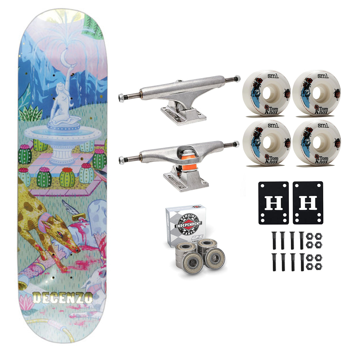 BEARINGS AND HARDWARE: Independent GP-S Bearings are engineered from the ground up with exclusive components. Key Features of Independent Genuine Parts Gp-S Skateboard Bearings: Dust proof metal outer shield, Serviceable shieldless back, All new faster and more durable Super Cage design, Micro polished steel races, Excellent oxidation resistance and corrosion protection, Water resistant, Extended wear protection. Also Includes 1" Phillips hardware and 1/8" Risers.