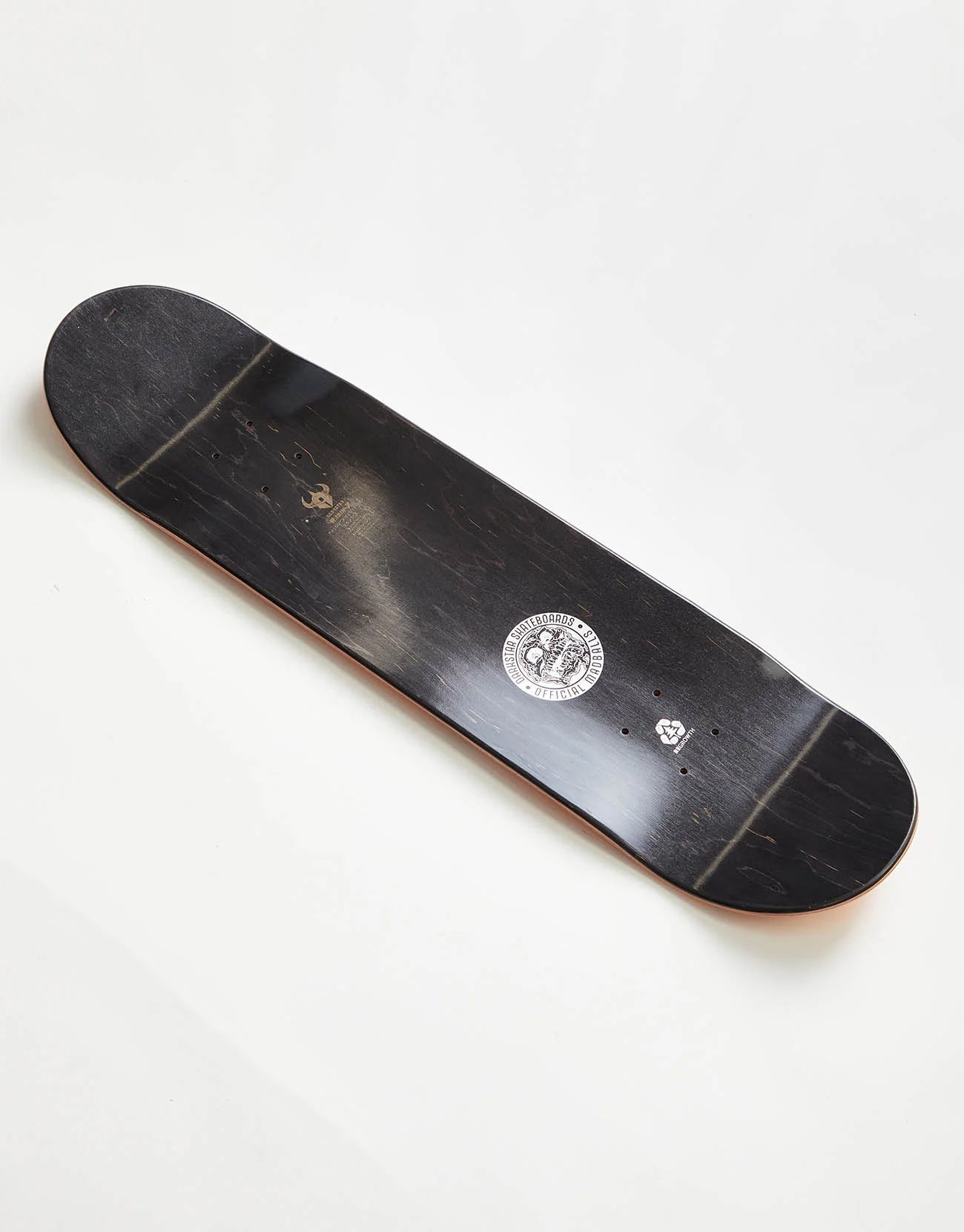 DECK: Resin-7 Canadian Maple Construction. Top stain color will vary. Resin-Ply is the new standard in all wood skateboards. Epoxy is more aggressive than the normal water-based glue, which is the industry standard. Since epoxy is so strong, less of it is used yielding a considerably lighter, better deck that is stiffer and keeps its pop longer than normal decks. Measures 8.0" x 31.6" with a 14" wheelbase.