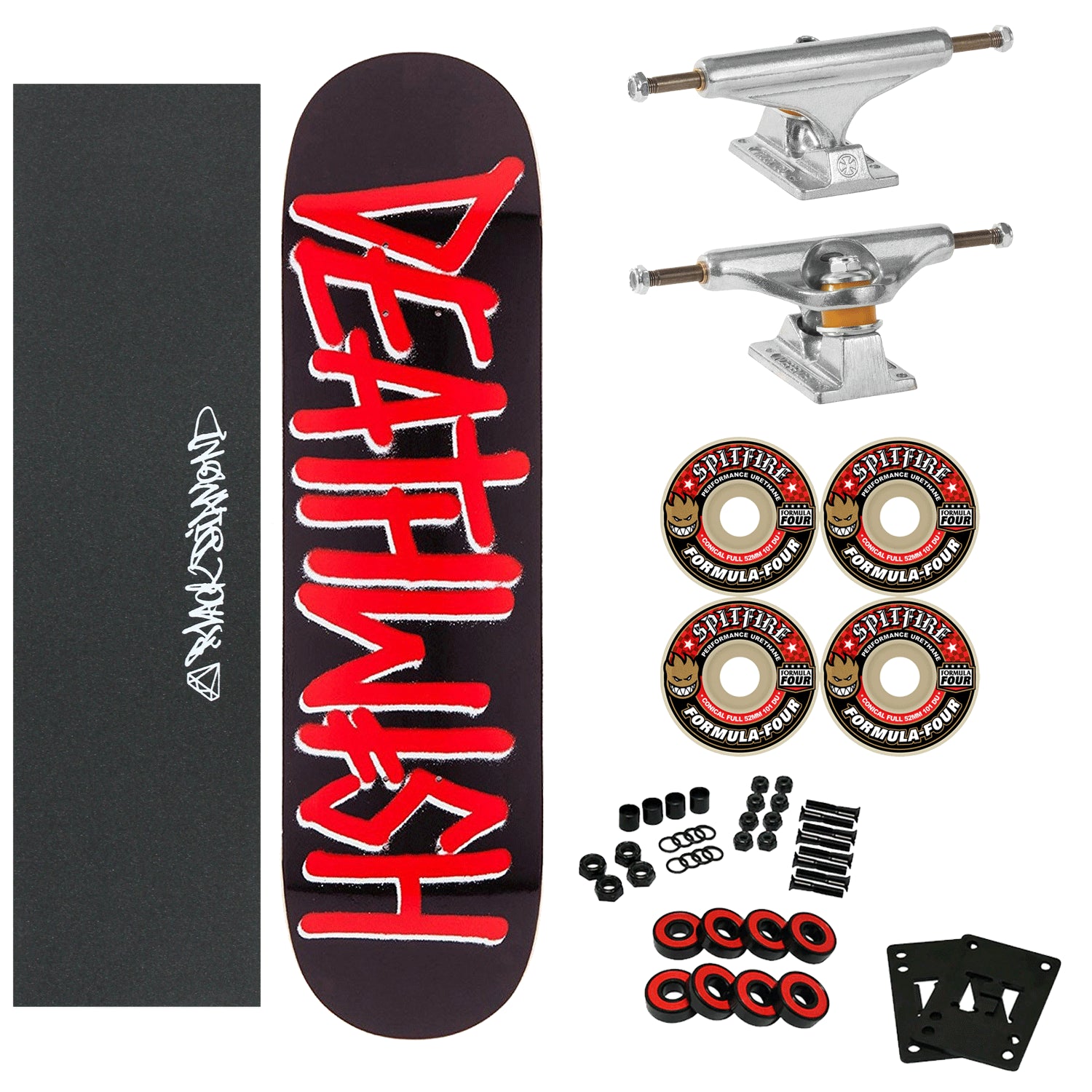 Brand New, 7-Ply Canadian Maple DEATHWISH Skateboard Deck. Durable, high performance truck for all types of skateboarding. 356 T6 Aluminum hanger and baseplate, solid Chromoly steel axle, grade 8 kingpin, Indy cushions with cylinder bottom. Featuring superior turn and stability, better grind clearance, improved no hang-up yoke for grind tricks, and less wheel bite. They last longer and are stronger on impact than any other truck on the market. 55mm ride height. Standard 4-Hole Baseplate. 149s measure 8.5" from axle tip-to-tip. Recommended deck size 8.25" - 8.75". Includes 2 Trucks. Spitfire Formula Four Conical Full 101A. Formulated for a harder, faster ride. Unmatched flatspot resistance. Smooth anti-stick slide. More speed and control. 100% true performance urethane. A wider version of the conical shape. Wide riding surface. Cut in sidewalls to decrease weight. A solid, controllable shape for all terrains. 52mm x 32.5mm, 101A.