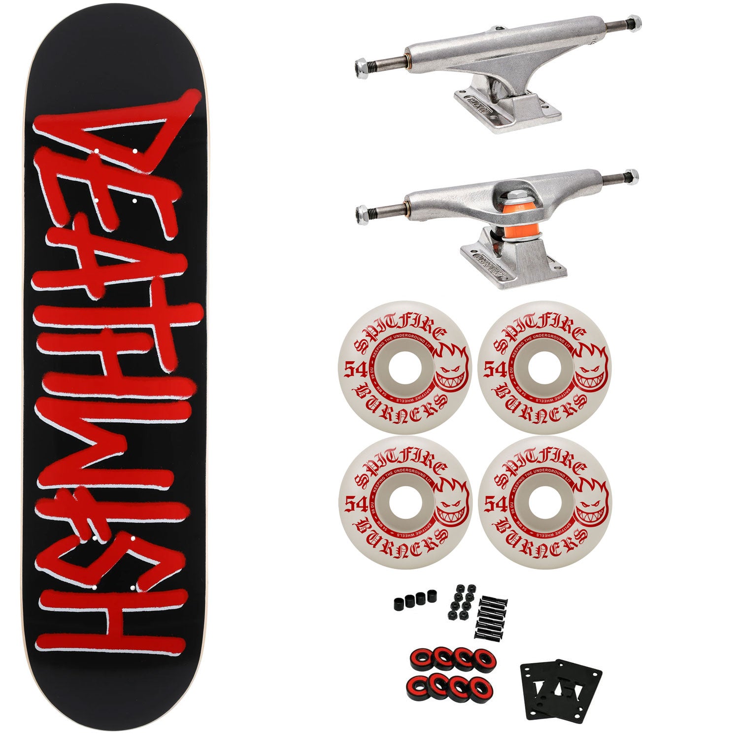 Includes hand selected components to make a premium complete that even the pros would be proud of. Top tier parts from leaders in the industry. Includes a Deathwish Deck, Independent Trucks, Spitfire Wheels, Abec 5 Bearings, Black Diamond Griptape, 1" Hardware and Risers.