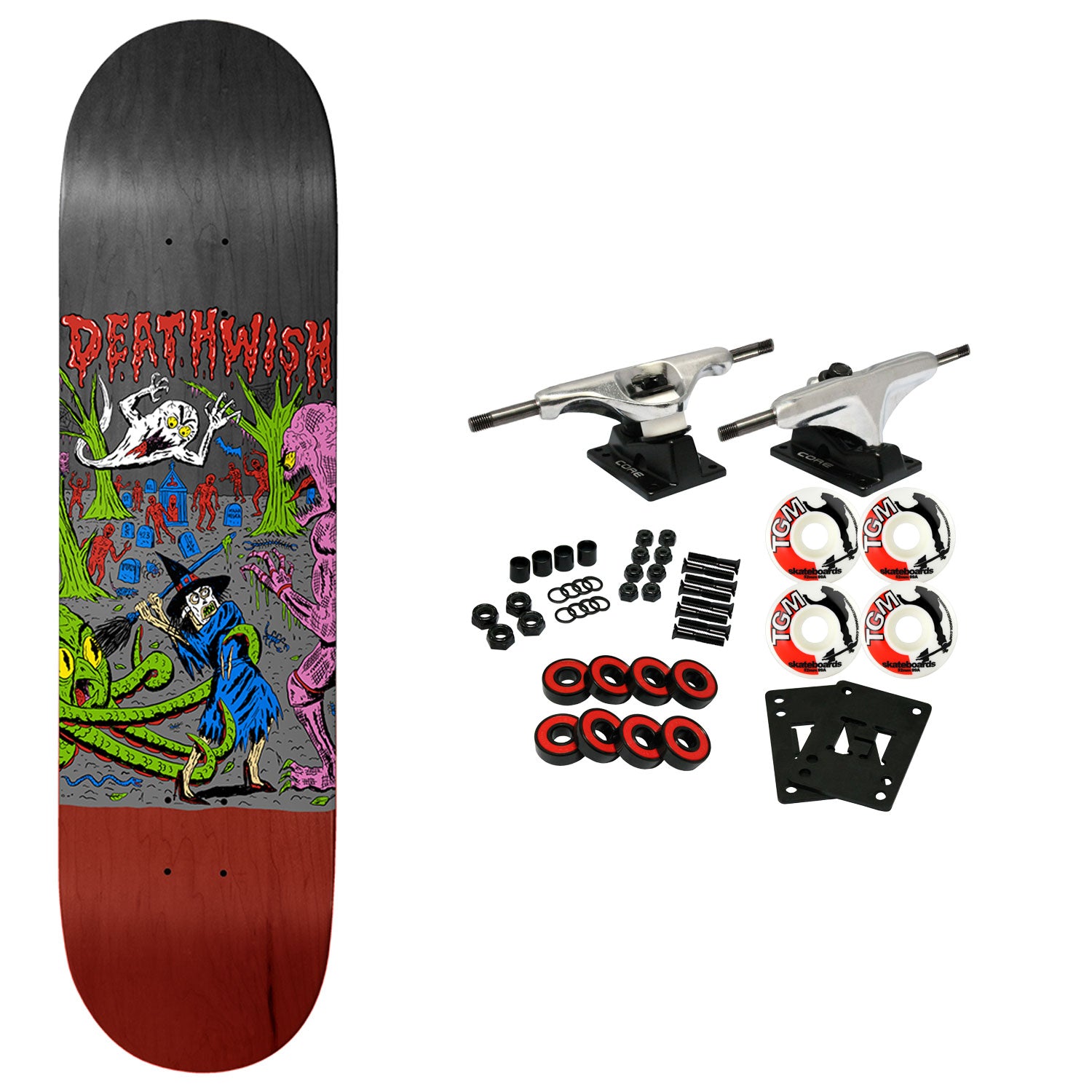 Deathwish Skateboards are constructed with 7-Ply Premium North American Maple. This deck measures 8.5"x 32". Full Heat Art by JJ Villard. Comes with Core trucks, 52mm TGM logo wheels, Amp abec 5 bearings, Black Diamond Griptape, risers, and hardware. Core trucks are light weight and feature heavy duty aluminum with grade 8 steel kingpins and axles, as well as USA made bushings and pivot cups. 52mm 99A are the perfect wheels for both street and park skating. Like the name states, Amp bearings are stimulants for your wheels! Light synthetic oil, Delrin Crowns, and Rubber Serviceable Shields are a few of the things that makes these bearings one of the best Abec 5 rated bearings on the market. Arrives un-assembled which allows for customization and a feeling of accomplishment. Skaters love building their boards! Easy to assemble!