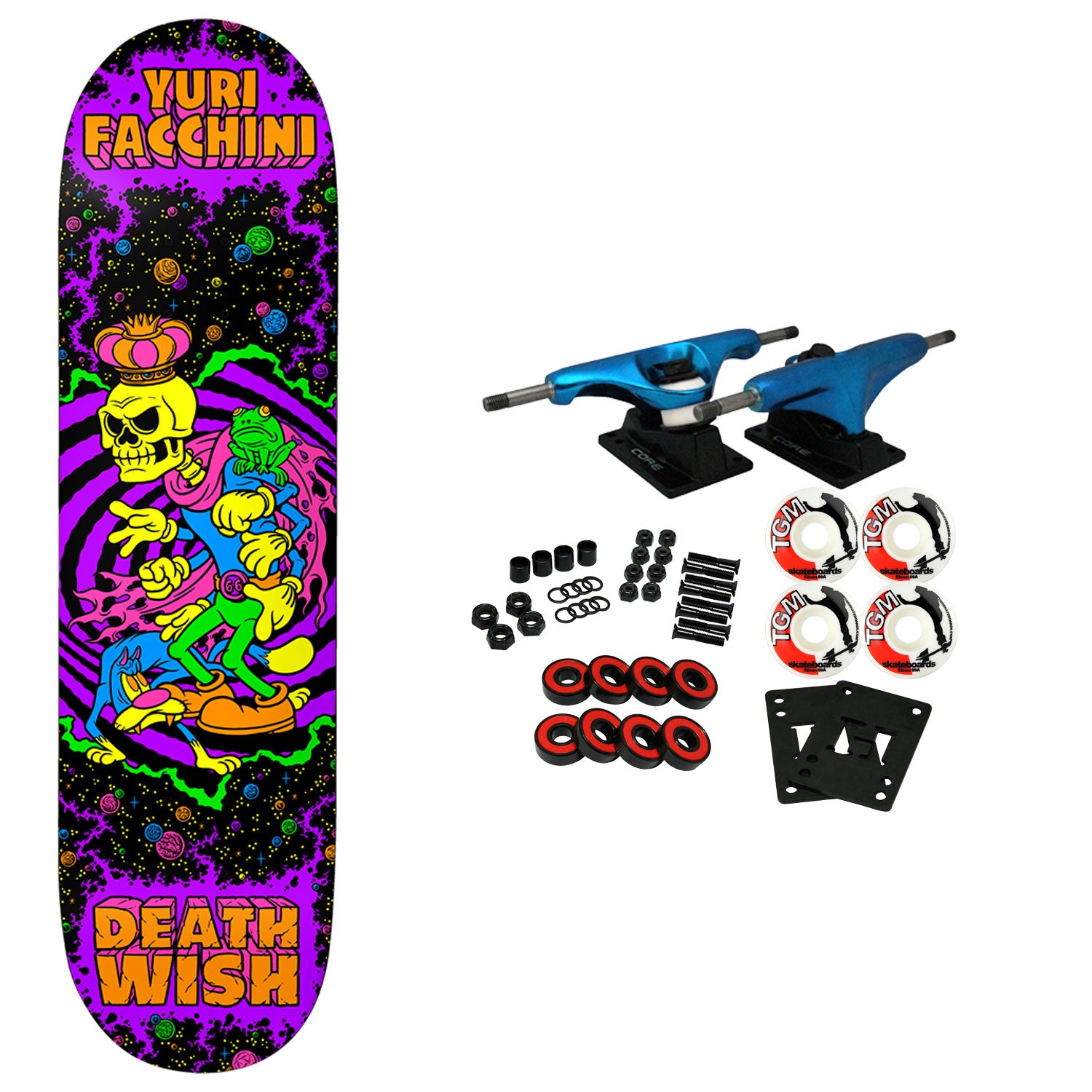 Deathwish Skateboards are constructed with 7-Ply Premium North American Maple. This deck measures 8.1"x 31.5". Lords of the Underworld Art by Brian Romero. Comes with Core trucks, 52mm TGM logo wheels, Amp abec 5 bearings, Black Diamond Griptape, risers, and hardware. Core trucks are light weight and feature heavy duty aluminum with grade 8 steel kingpins and axles, as well as USA made bushings and pivot cups. 52mm 99A are the perfect wheels for both street and park skating. Like the name states, Amp bearings are stimulants for your wheels! Light synthetic oil, Delrin Crowns, and Rubber Serviceable Shields are a few of the things that makes these bearings one of the best Abec 5 rated bearings on the market. Arrives un-assembled which allows for customization and a feeling of accomplishment. Skaters love building their boards! Easy to assemble!