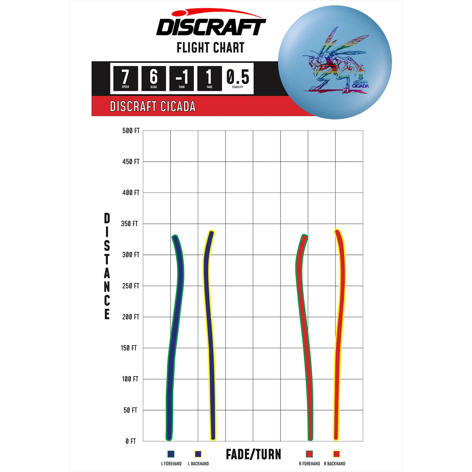 Discover a disc that soars beyond the ordinary, the Cicada, Discraft's latest in the realm of drivers. Fashioned from Z plastic, the Cicada ensures lasting beauty and performance. Its durability mirrors the tenacity of the cicada which has stood the test of time. With a trajectory that's undeniably straight, the Cicada is a force to be reckoned with. Unleash its potential and watch it flip seamlessly. This disc embodies the spirit of adaptability, offering players the versatility needed for strategic shot shaping throughout any course. The Cicada finds its rightful place in Discraft's lineup. It doesn’t just belong; it thrives, elevating the game of disc golf and complementing Discraft's legacy of producing outstanding discs.
